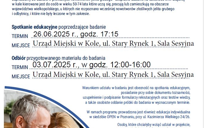 Serdecznie zapraszamy na bezpłatne badania profilaktyczne jelita grubego! – Ośrodek Profilaktyki i Epidemiologii Nowotworów w Poznaniu rozpoczyna w mieście Kole realizację programu pod nazwą „Profilaktyka nowotworów dolnego odcinka przewodu pokarmowego realizowana przez OPEN S.A. na terenie całej Wielkopolski w latach 2024-2027”. Projekt ten jest realizowany w ramach Programu Fundusze Europejskie dla Wielkopolski 2021-2027 (FEW) współfinansowanego ze środków Europejskiego Funduszu Społecznego…