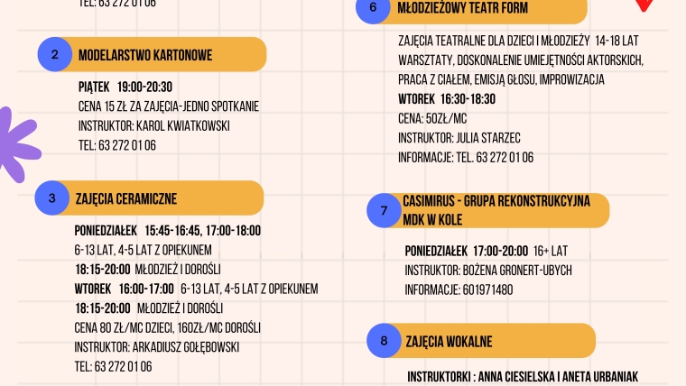 Miejski Dom Kultury w Kole zaprasza do udziału w zajęciach w nowym sezonie artystycznym 2025/26 Zapisy na zajęcia w MDK w Kole. Tel. 632720106 –