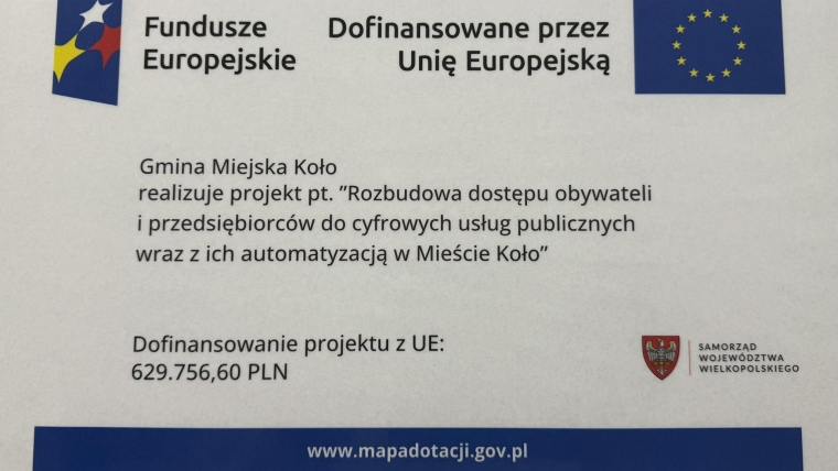 Miasto Koło realizuje projekt ze środków Unii Europejskiej mający na celu rozbudowę dostępu obywateli i przedsiębiorców do usług Urzędu Miejskiego. Wysokość dofinansowania: 629.755,60 zł. –