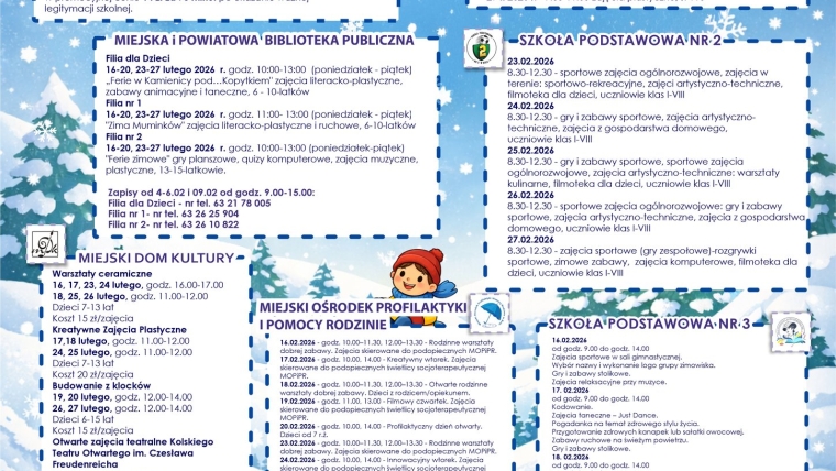 Miejski Dom Kultury w Kole informuje! Plan aktywności feryjnych w Miejskim Domu Kultury w Kole na rok 2026 1. Warsztaty ceramiczne 16, 17, 23, 24 lutego, godz. 16.00-17.00 18, 25, 26 lutego, godz. 11.00-12.00 Dzieci 7-13 lat Koszt 15 zł/zajęcia 2. Kreatywne Zajęcia Plastyczne 17,18 lutego, godz. 11.00-12.00 24, 25 lutego, godz. 11.00-12.00 Dzieci 7-13 lat Koszt 20 zł/zajęcia 3.…