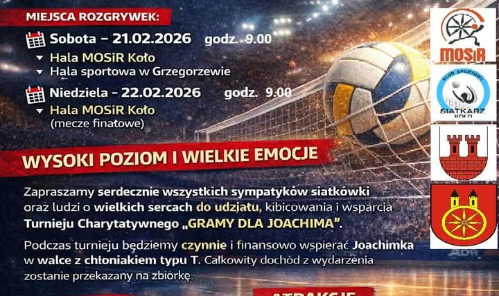 Serdecznie zapraszamy na charytatywny turniej piłki siatkowej „GRAMY DLA JOACHIMA”\- – Przed nami 2 dni zmagań siatkarskich, w których będziemy promować siatkówkę oraz zdrowy tryb życia ale również będziemy czynnie pomagać w zbiórce pieniędzy na leczenie Joachima. Zapraszamy wszystkie drużyny do uczestnictwa oraz wszystkich ludzi o dobrym sercu do kibicowania i wspierania. Nie zabraknie emocji, pysznego jedzenia i świetnej zabawy!!!…