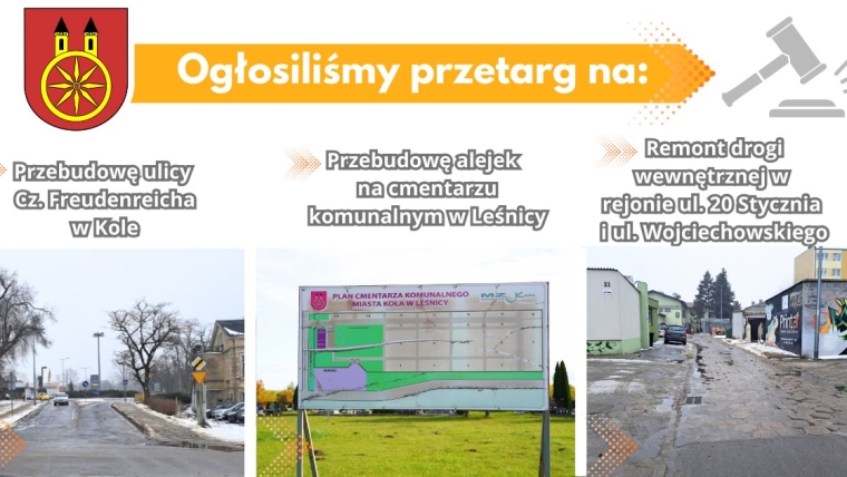 Miasto Koło ogłosiło postępowania przetargowe na realizację trzech ważnych inwestycji infrastrukturalnych: Przebudowa ul. Cz. Freudenreicha Przebudowa alejek na Cmentarzu Komunalnym w Leśnicy Remont drogi wewnętrznej w rejonie ul. 20 Stycznia i Wojciechowskiego Termin składania ofert: 27 marca 2026 r., godz. 12:00. Zachęcamy zainteresowane firmy do zapoznania się ze szczegółami postępowań w dokumentacji przetargowej. Ogłoszenie: https://www.kolo.pl/…/realizacja-trzech-zada… –