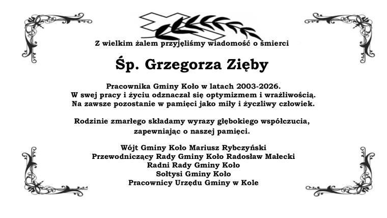 Gmina Koło– Informacja – W związku ze śmiercią naszego Kolegi Śp. Grzegorza Zięby i umożliwieniem pozostałym pracownikom wzięcie udziału w uroczystościach pogrzebowych 18 marca 2026r. (środa) Urząd Gminy w Kole czynny będzie od 7.30 do 12.00. Uroczystość pogrzebowa rozpocznie się o 13.00 w Kościele w Umieniu. Wójt Gminy Koło Mariusz Rybczyński –