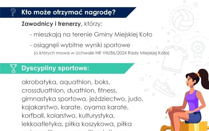 Uwaga sportowcy – nabór wniosków do końca marca. – Uwaga sportowcy – do końca marca Burmistrz Miasta Koła przyjmuje wnioski! Kto może otrzymać nagrodę? Zawodnicy i trenerzy, którzy: – mieszkają na terenie Gminy Miejskiej Koło, – osiągnęli wybitne wyniki sportowe (o których mowa w Uchwale Nr VIII/86/2024 Rady Miejskiej Kota) Dyscypliny sportowe: akrobatyka, aquathlon, boks, crossduathlon, duathlon, fitness, gimnastyka sportowa, jeździectwo, judo,…