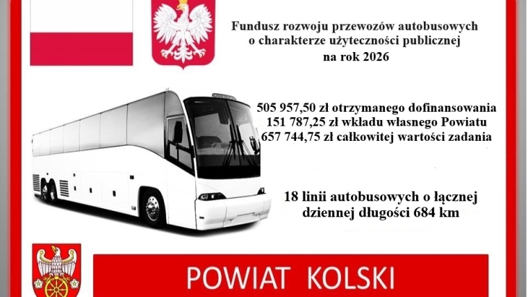Powiat Kolski – dobre wieści dla mieszkańców Powiatu Kolskiego! Z radością informujemy, że nasz powiat został beneficjentem projektu w ramach Funduszu Rozwoju Przewozów Autobusowych o charakterze użyteczności publicznej. Na mocy umowy zawartej 11 lutego 2026 roku z Wojewodą Wielkopolskim Agata Sobczyk, w 2026 roku zrealizujemy zadanie organizacji publicznego transportu zbiorowego na naszym terenie. Szczegóły projektu: Całkowita wartość: 657 744,75 zł…