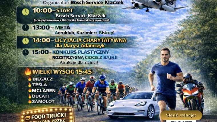 Zapraszamy na Rajd Rowerowy Kręcimy Kilometry dla Marysi Adamczyk z Kramska, który odbędzie się 11 kwietnia 2026. Start: Bosch Service Klaczek, ul. Świętojańska 24B, Konin. Meta: Aeroklub Kazimierz Biskupi REGULAMIN I KARTA ZGŁOSZENIA NA RAJD ROWEROWY: https://drive.google.com/…/1WoiHbmhpImOquG…/view? https://drive.google.com/…/1kq…/view? Więcej informacji: https://www.facebook.com/events/s/rajd-z-wyscigiem-na-lotnisku-k/2070149933914256/ – –