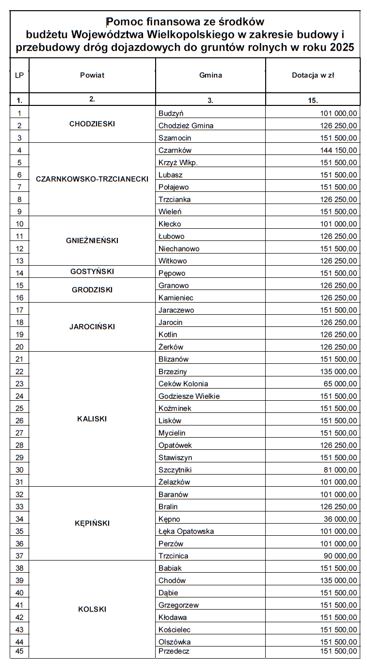 Ponad 19 mln zł z budżetu Województwa Wielkopolskiego umożliwi 151 Gminom realizację zadań budowy lub przebudowy dróg dojazdowych o pól. Wysokie koszty realizacji inwestycji drogowych powodują, że wsparcie Samorządu Województwa Wielkopolskiego w znaczący sposób umożliwa realizację prac na lokalnych drogach. Regularne inwestycje w rozbudowę sieci dróg dojazdowych pozwalają utrzymać je w należytym stanie i umożliwić bezpieczne przemieszczanie się mieszkańców i rolników. – mówi Wicemarszałek Województwa Wielkopolskiego Krzysztof Grabowski