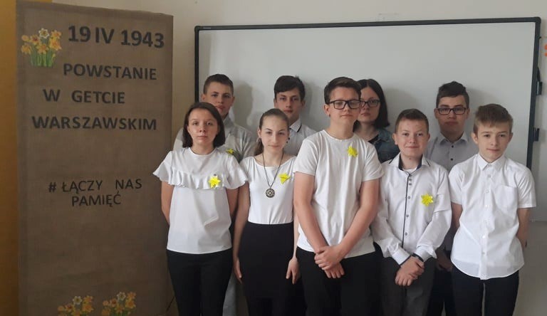 W tym celu uczniowie klasy VII i VIII wzięli udział w dziesiątej, jubileuszowej akcji społeczno-edukacyjnej Żonkile. 19 kwietnia bieżącego roku przypada79 rocznica wybuchu powstania w getcie warszawskim. O smutnych wydarzeniach z tamtych czasów w ramach akcji społeczno-edukacyjnej została przeprowadzona lekcja z wykorzystaniem między innymi przygotowanych przez Muzeum POLIN materiałów edukacyjnych. Podczas lekcji uczniowie zostali zapoznani przez Panią Bogumiłę Lasota z informacjami historycznymi na temat getta warszawskiego. Uczniowie wysłuchali również w wersji audio opowiadania Marcina Szczygielskiego pod tytułem „Prawdziwi przyjaciele”. Opowiadanie przypominało znaną prawdę, że prawdziwych przyjaciół poznajemy w biedzie. Ponadto uczniowie obejrzeli stworzony w stylistyce youtuberskiej film „Muranów – Dzielnica Północna”. Film był opowieścią o żydowskiej historii dzielnicy Muranów w Warszawie. Narratorka Ala, młoda warszawska Żydówka, zabrała naszych widzów w multimedialną podróż po różnych miejscach Muranowa i opowiadała najważniejsze historie z nim związane z okresu ostatnich stuleci. Film zawierał animacje, archiwalne zdjęcia i fotografie.