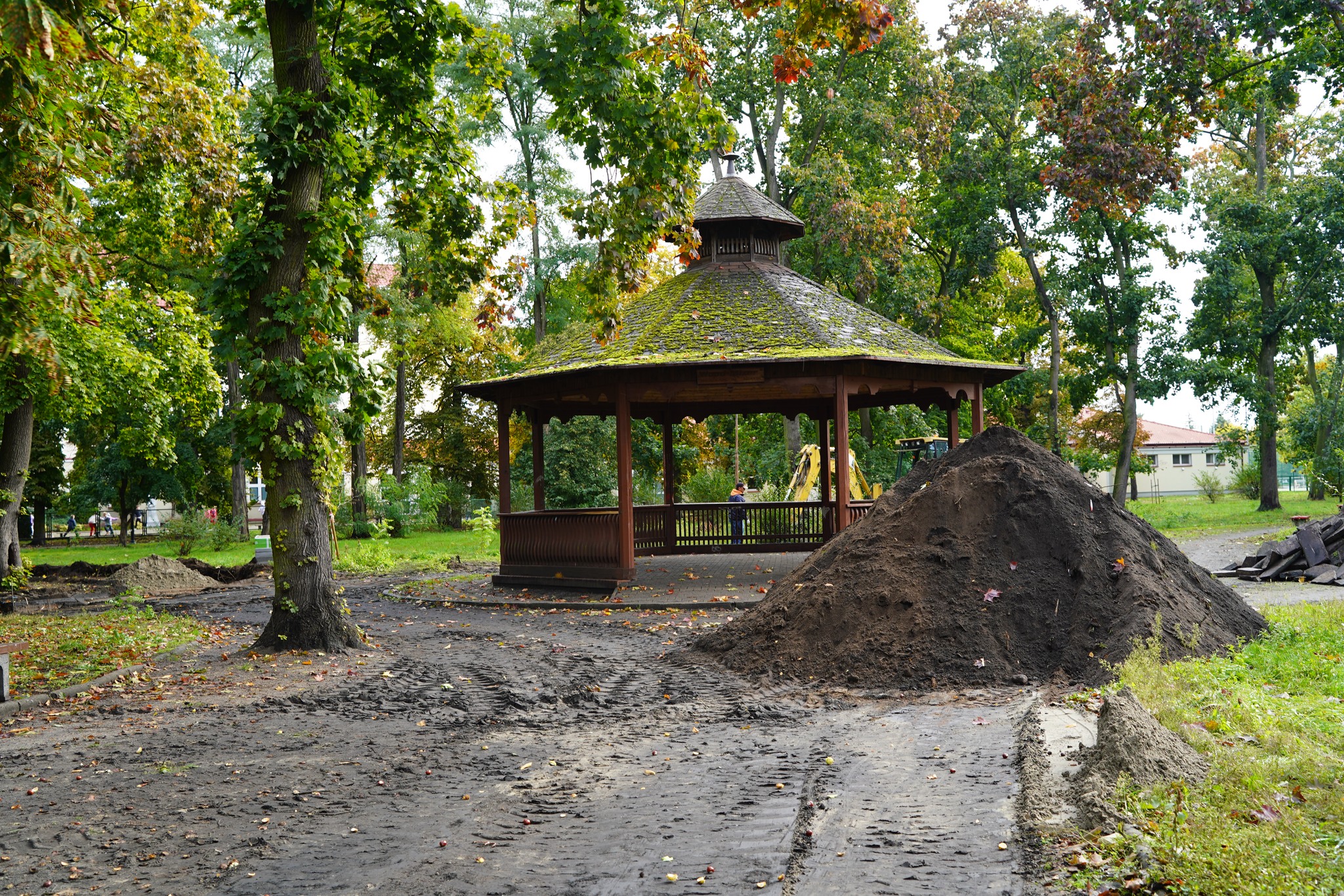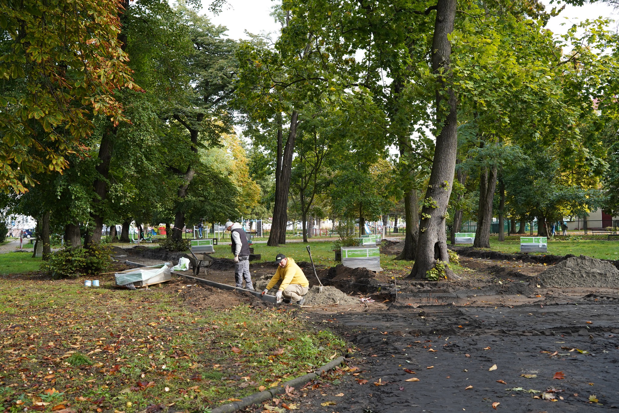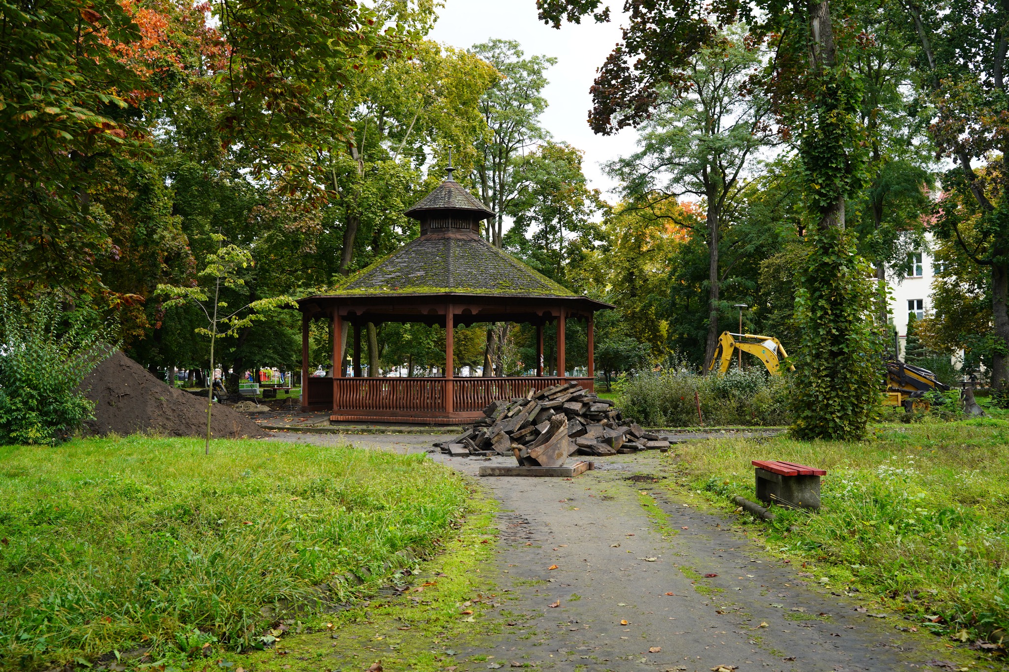 Lokalna firma MK Stella Konrad Marek realizuje przebudowę nawierzchni alei i wymianę elementów małej architektury w Parku im. St. Moniuszki w Kole.