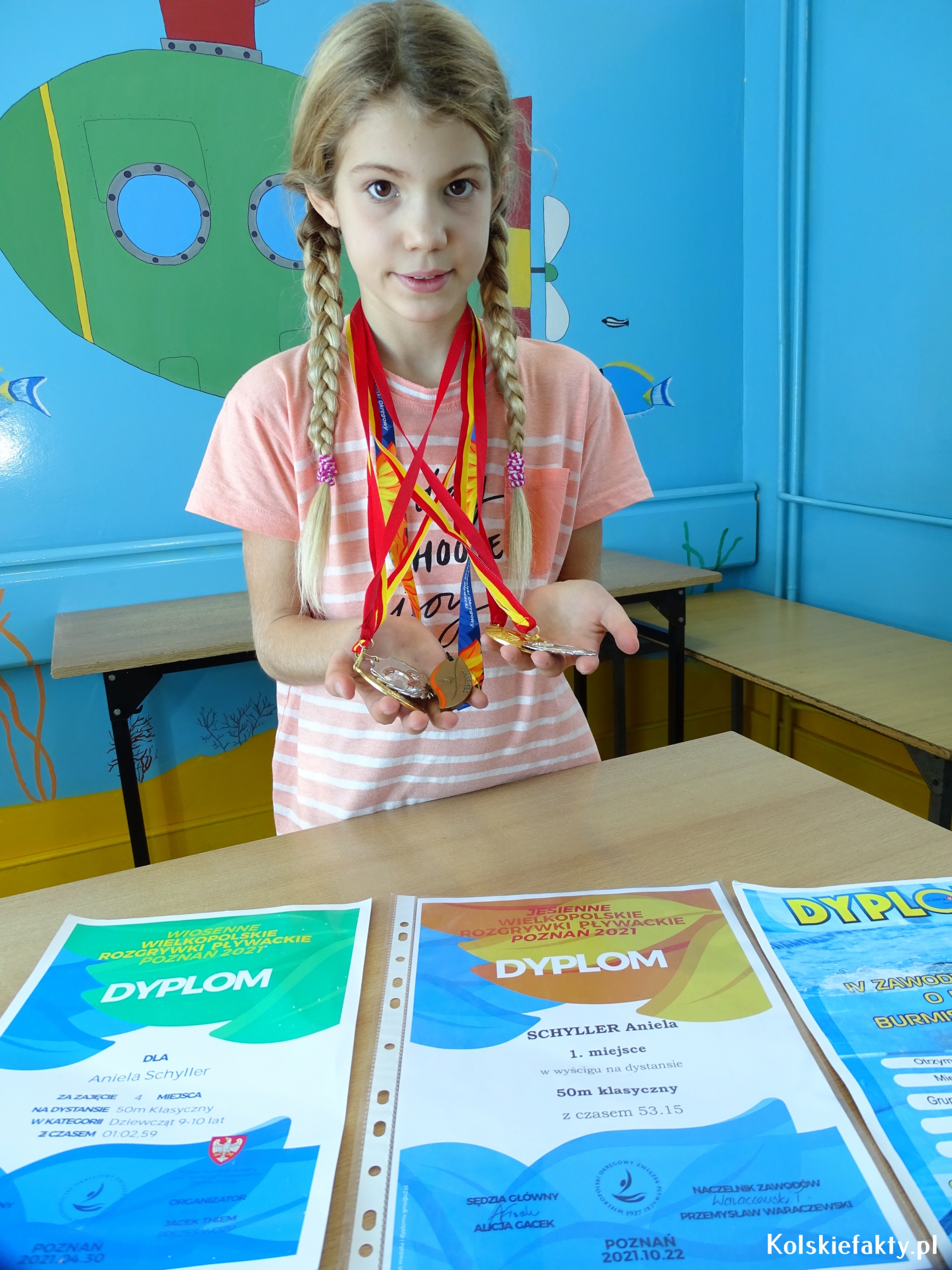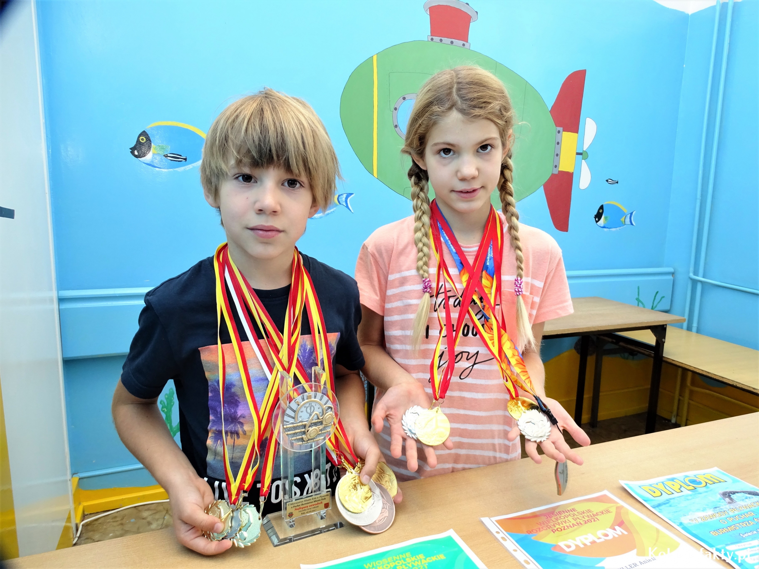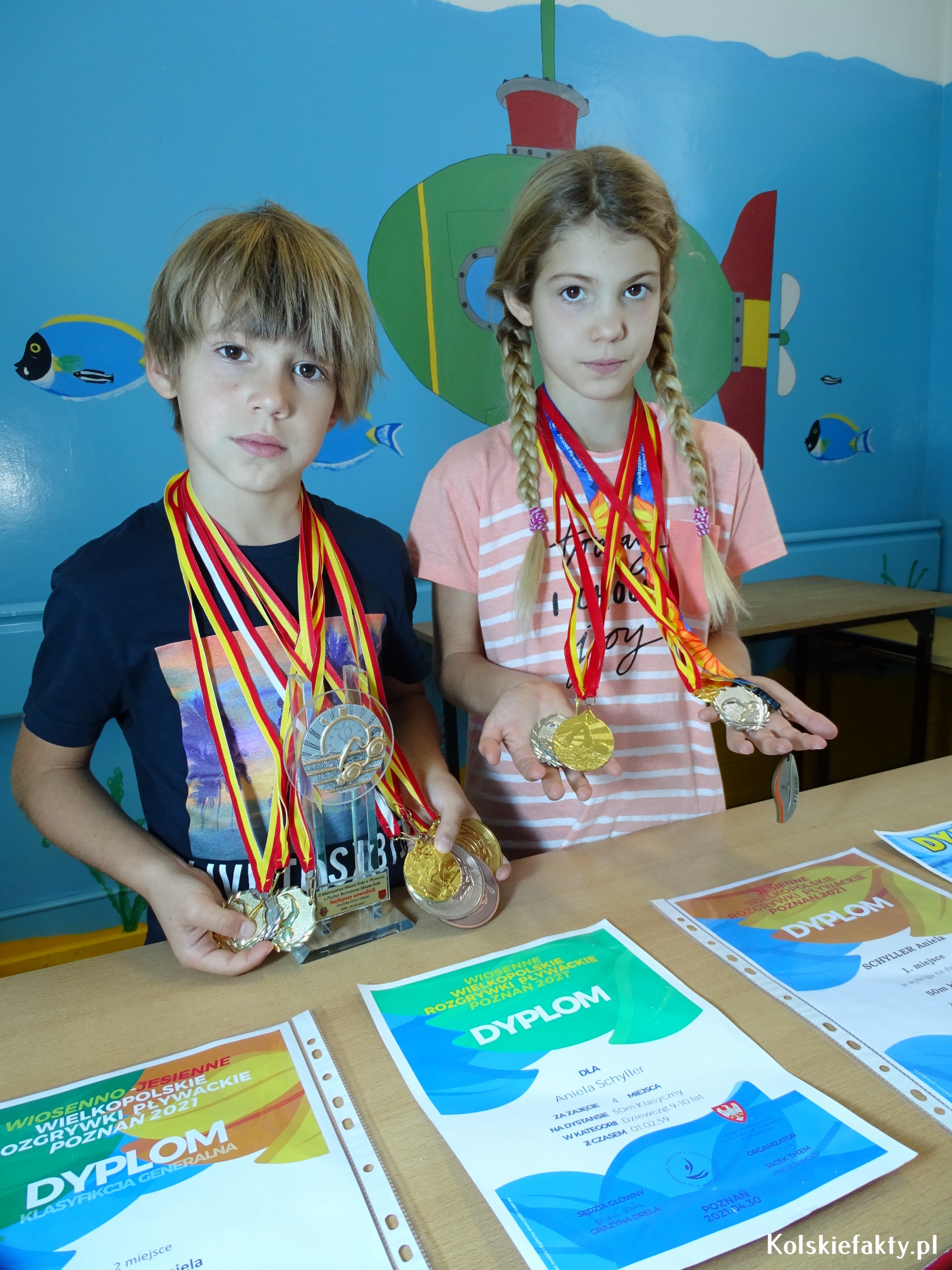 Dzieci znane są z chłonięcia wszelkich informacji i umiejętności oraz szybkiego przyswajania wiedzy. Z tego względu, niektóre umiejętności, jak np. pływanie, warto rozwijać od najmłodszych lat. Tak też było w przypadku Anieli i Franka Schyller- rodzeństwa, którego wspólną pasją jest pływanie. Oboje uczą się w Szkole Podstawowej nr 1 w Kole. Aniela jest uczennicą klasy trzeciej, Franek w tym roku rozpoczął naukę w klasie pierwszej. Woda jest zdecydowanie ich żywiołem. Od zawsze uwielbiali zabawy w wodzie i co najważniejsze, wcale się jej nie bali. Nauczyli się pływać na basenie pod okiem wykwalifikowanych instruktorów. Oboje trenują w Klubie MUKS Huragan Koło. Trenerem Anielki jest Michał Oczkowski, natomiast Franka trenuje Eryk Tomaszewski. Mając 6 lat zaczęli pływać w grupach pływackich. W wieku 7 lat wzięli udział w pierwszych zawodach pływackich.