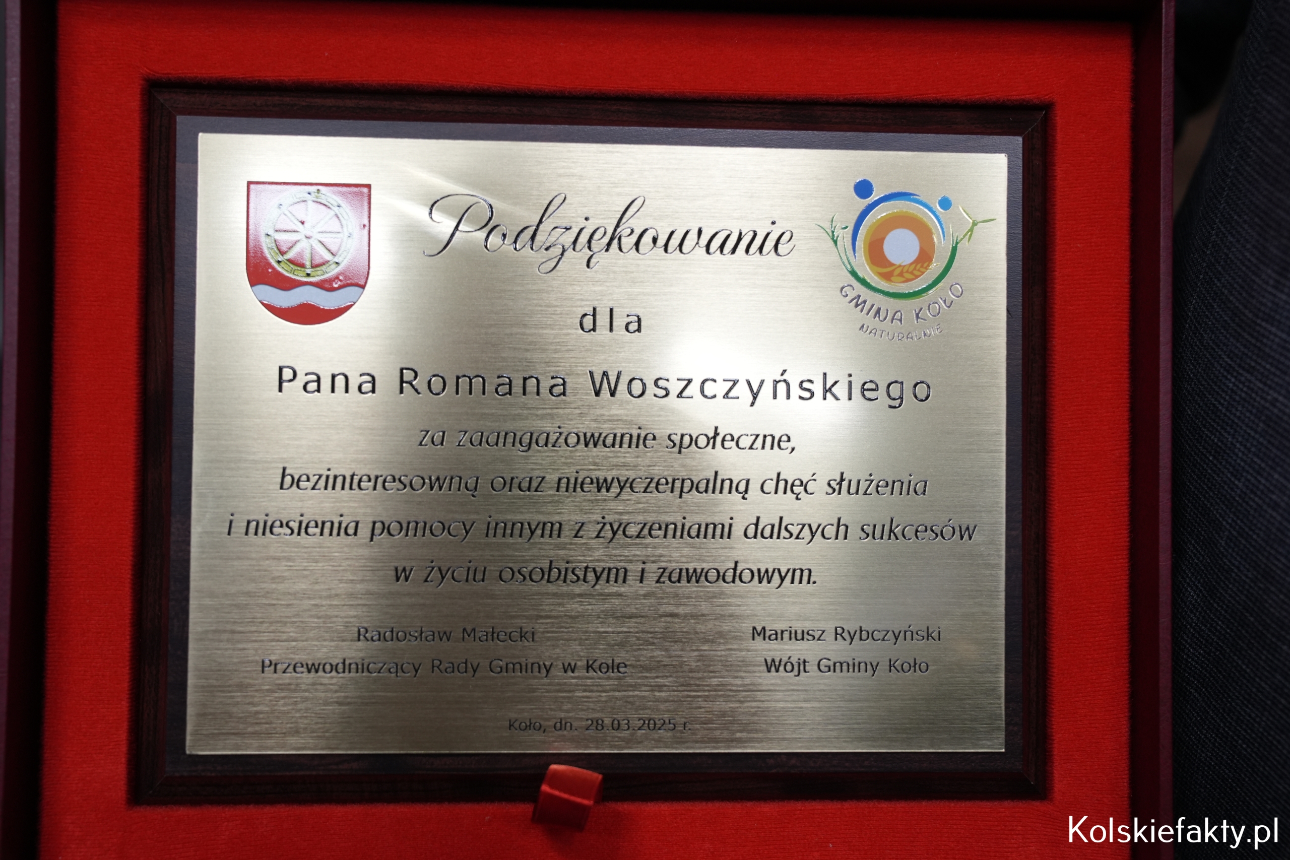 Podczas dzisiejszej XI Sesji Rady Gminy w Kole miało miejsce wyjątkowe wydarzenie, które na długo pozostanie w pamięci Romana Woszczyńskiego – Druha OSP Wrząca Wielka, a także Radnego Rady Gminy w Kole. Jego heroiczne czyny, które wielokrotnie przyczyniły się do ratowania ludzkiego życia, zostały docenione przez władze i mieszkańców gminy.