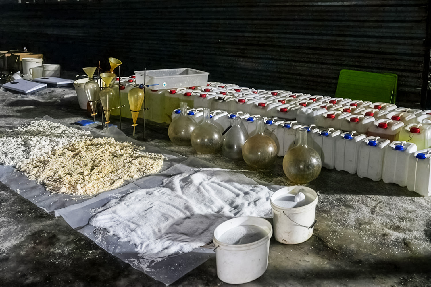 – 350 litrów prekursorów do produkcji mefedronu, alfa-PVP i amfetaminy.