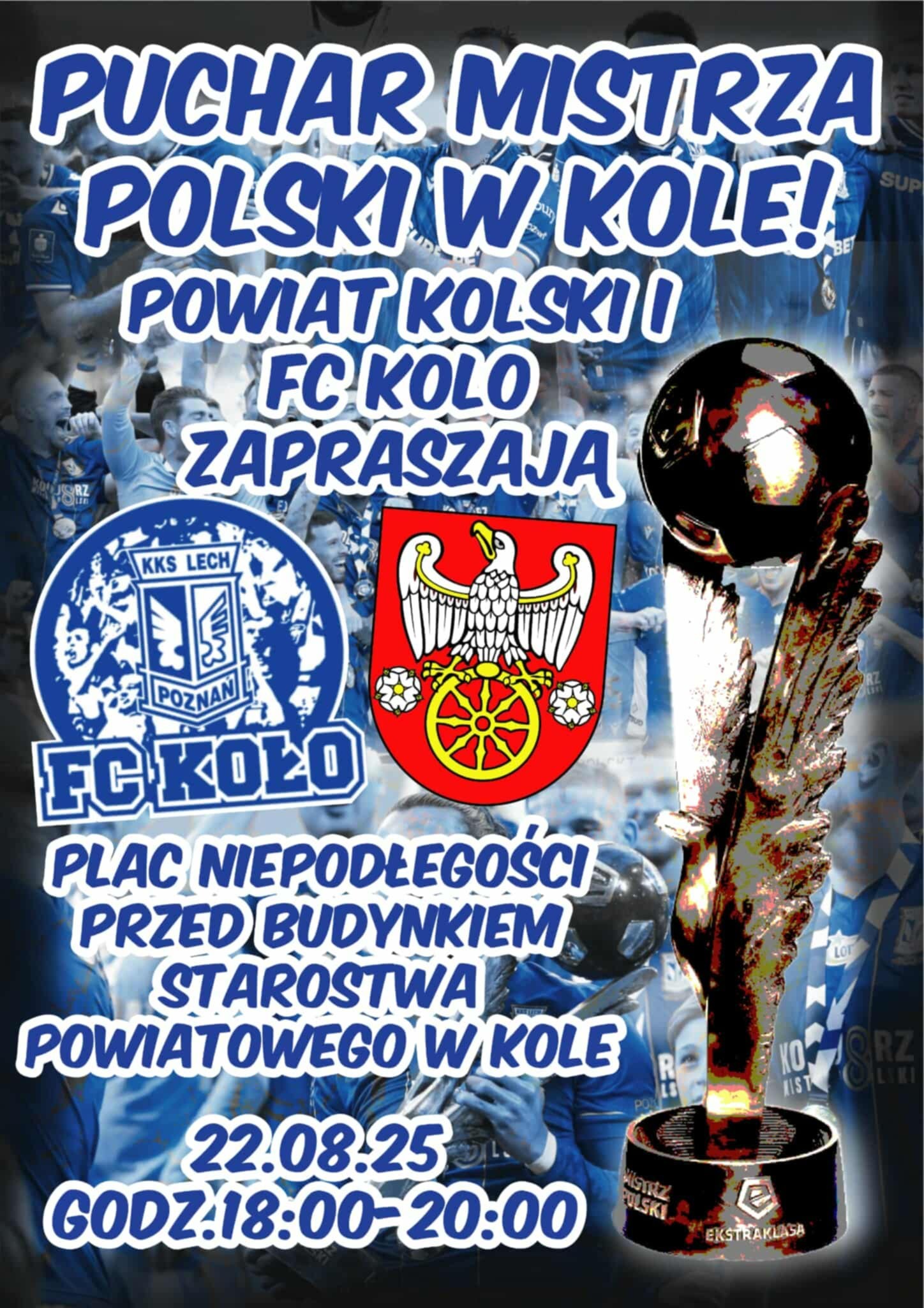 Starostwo Powiatowe w Kole oraz FC Koło z ogromną radością informują, że w ramach akcji „Mistrzowie na Landach” do naszego miasta zawita Puchar za Mistrzostwo Polski! 🏆💙🤍