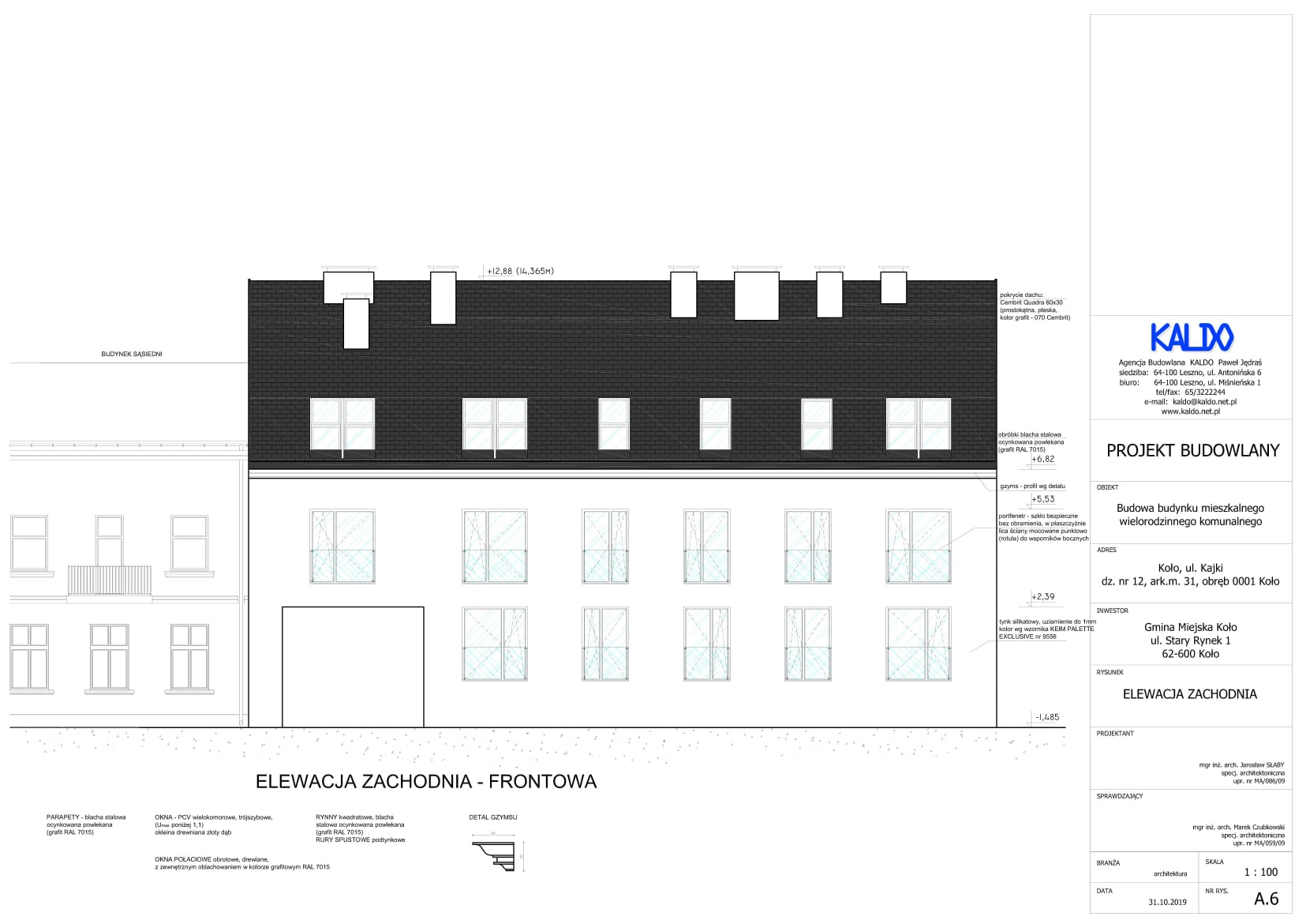 1. Przedmiotem zamówienia jest budowa budynku komunalnego przy ulicy Kajki w Kole w ramach której zostanie wybudowany budynek mieszkalny wielorodzinny z szesnastoma mieszkaniami komunalnymi. Budynek będzie 2-kondygnacyjny, z poddaszem użytkowym, częściowo podpiwniczony. Budynek jest zlokalizowany po zachodniej stronie działki, w granicy z ulicą Kajki. Wejście do budynku znajduje się od strony podwórza, a dojście na podwórze w przejściu pod budynkiem na poziomie parteru. Na podwórzu zaprojektowano utwardzenie terenu, na którym wyznaczono dziesięć stanowisk postojowych, w tym trzy przeznaczone dla osób niepełnosprawnych. Dojście do budynku i dojazd do miejsc postojowych ciągiem pieszo-jezdnym szerokości 4,5 – 5,0 m. Na całym odcinku dojścia, począwszy od ulicy, do wejścia do budynku, nie projektuje się żadnych stopni schodowych. Miejsce na gromadzenie odpadów bytowych wyznaczono na działce komunalnej o numerze geodezyjnym 49,po przeciwnej stronie ulicy. Działka jest zabudowana innym budynkiem mieszkalnym komunalnym (od strony Rynku) i na niej wyodrębniono plac śmietnikowy wspólny dla mieszkańców obu budynków – istniejącego i projektowanego w ramach niniejszego opracowania. Długość dojścia do tego placu z projektowanego budynku wynosi 78 m. Pozostała część działki zostanie zagospodarowana zielenią – trawnikiem i krzewami. Istnieje możliwość wykorzystania tego terenu do rekreacji dla mieszkańców. Niewielki fragment granicy z działką sąsiednią nr 13 (po stronie południowej), który nie jest zabudowany istniejącym lub projektowanym budynkiem, zostanie wygrodzony ogrodzeniem systemowym panelowym o wysokości 1,8 m z siatki zgrzewanej mocowanej do słupków stalowych, na podmurówce betonowej.