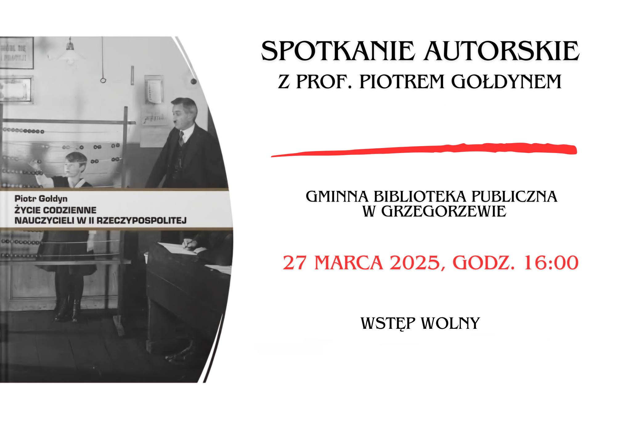 Gminna Biblioteka Publiczna w Grzegorzewie zaprasza na spotkanie autorskie z Piotrem Gołdynem, autorem książki „Życie codzienne nauczycieli w II Rzeczypospolitej”.
