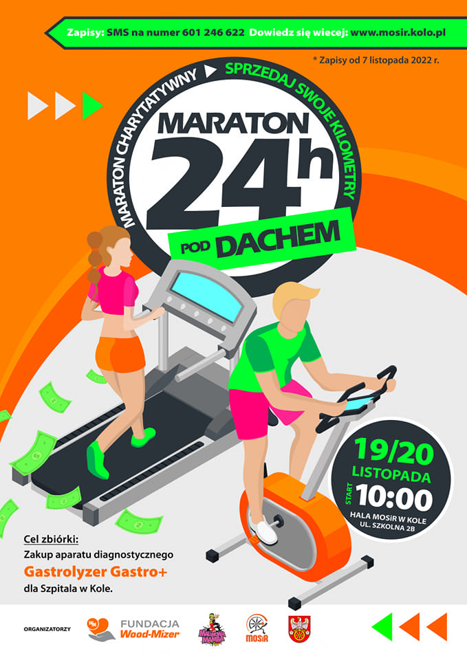 Trzeci raz to już tradycja Więc Zapraszamy tradycyjnie na 3 Maraton Charytatywny 24 h pod dachem Tradycyjnie też, będziemy kręcili kilometry na bieżniach i rowerach stacjonarnych, które zostaną przeliczone na złotówki /Tym razem zbieramy na zakup aparatu diagnostycznego Gastrolyzer Gastro +, którym chcemy wyposażyć Szpital w Kole  Mamy nadzieję, też tradycyjnie, że zapełnimy Wami nasze bieżnie i rowerki. Jeśli nie możesz wesprzeć nas bezpośrednio biorąc udział w naszym wydarzeniu, zachęcamy Cię do wsparcia naszej zrzutki online! Dziękujemy za każdą, nawet najmniejszą wpłatę – razem możemy więcej!