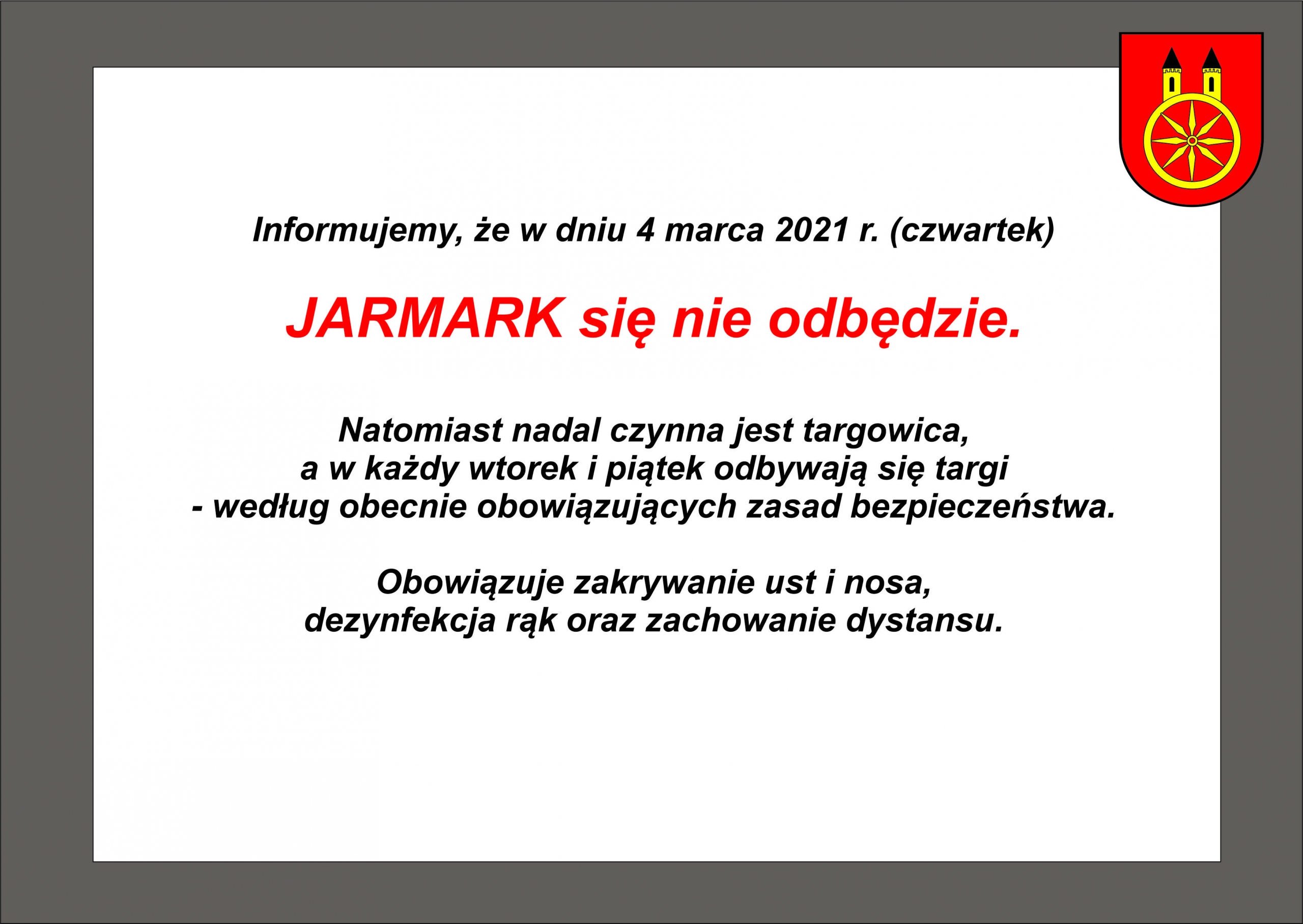 Informujemy, że w dniu 4 marca 2021 r. (czwartek) JARMARK się nie odbędzie.