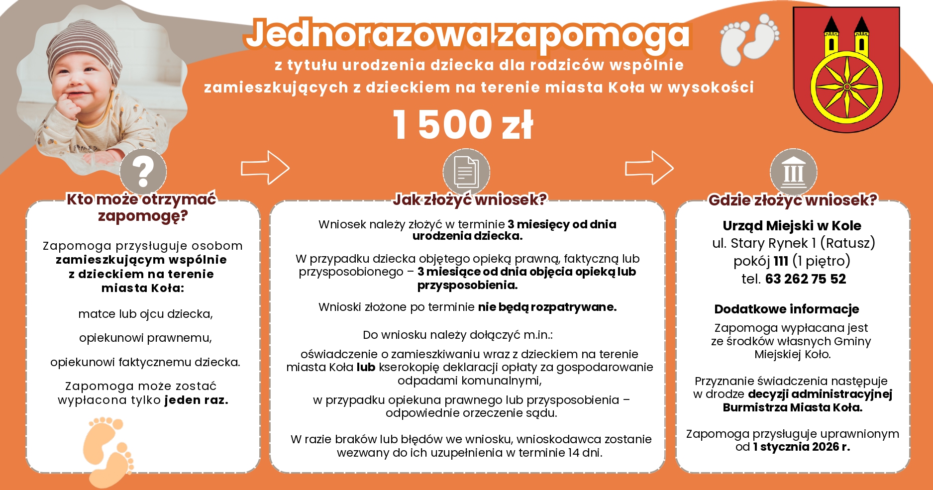 30 grudnia, 2025 Aktualnosci Jednorazowa zapomoga z tytułu urodzenia dziecka dla rodziców wspólnie zamieszkujących z dzieckiem na terenie miasta Koła. Szczegóły pod linkiem: https://www.kolo.pl/…/jednorazowa-zapomoga-z-tytuu… – Udostępnij: