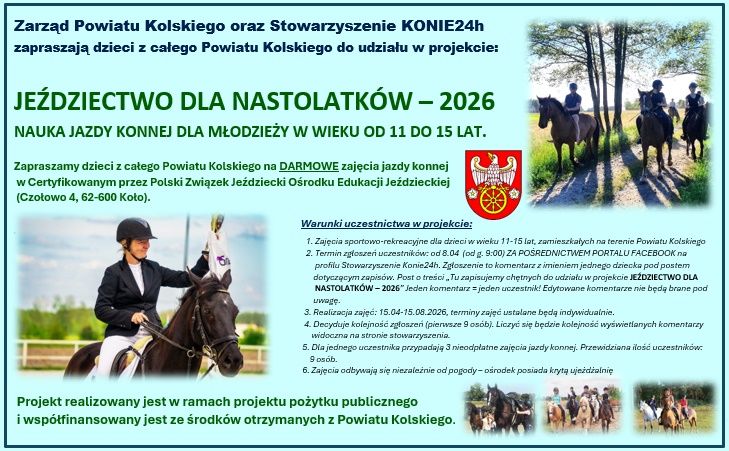 Zarząd Powiatu Kolskiego oraz Stowarzyszenie Konie24h przy Ośrodku Edukacji Jeździeckiej w Czołowie zapraszają dzieci z całego Powiatu Kolskiego do udziału w projekcie: