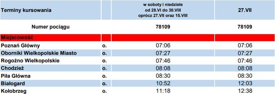Oferta obowiązuje przy przejazdach pociągiem dodatkowym, uruchamianym przez przewoźnika Koleje Wielkopolskie sp. z o.o. na odcinku (w obu kierunkach) Poznań Główny – Kołobrzeg (przez stacje: Oborniki Wielkopolskie Miasto, Rogoźno Wielkopolskie, Chodzież, Piła Główna, Białogard). Pociąg dodatkowy objęty jest limitacją miejsc. Przejazd odbywa się na podstawie biletu jednorazowego, który musi zawierać nadruk z napisem: „Oferta specjalna”.