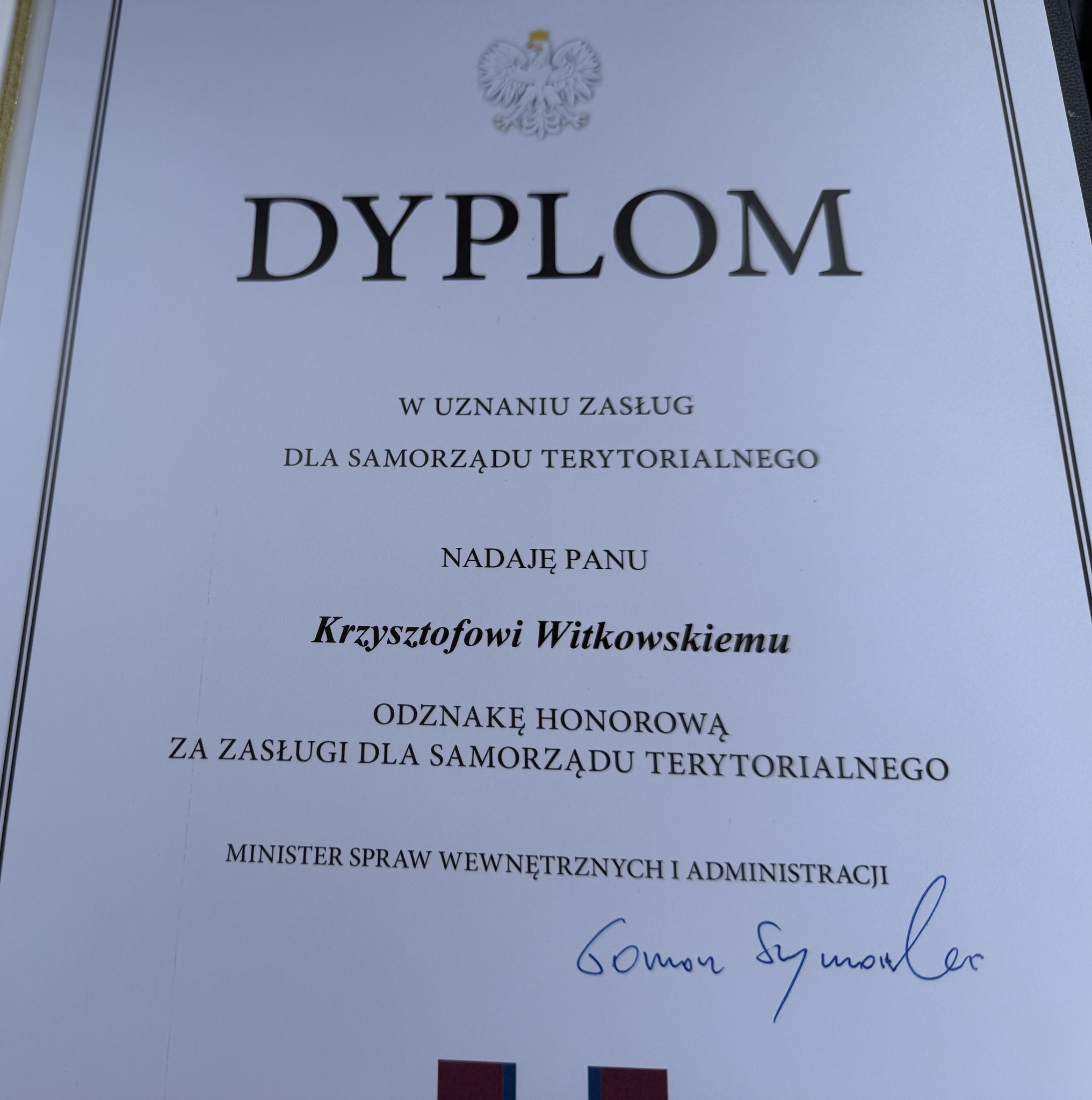 Nasz włodarz Krzysztof Witkowski odebrał dzisiaj w Ministerstwie Spraw Wewnętrznych i Administracji z rąk Wiceministra, Posła Wiesława Szczepańskiego, Odznakę Honorową „Za zasługi dla Samorządu Terytorialnego”. /
