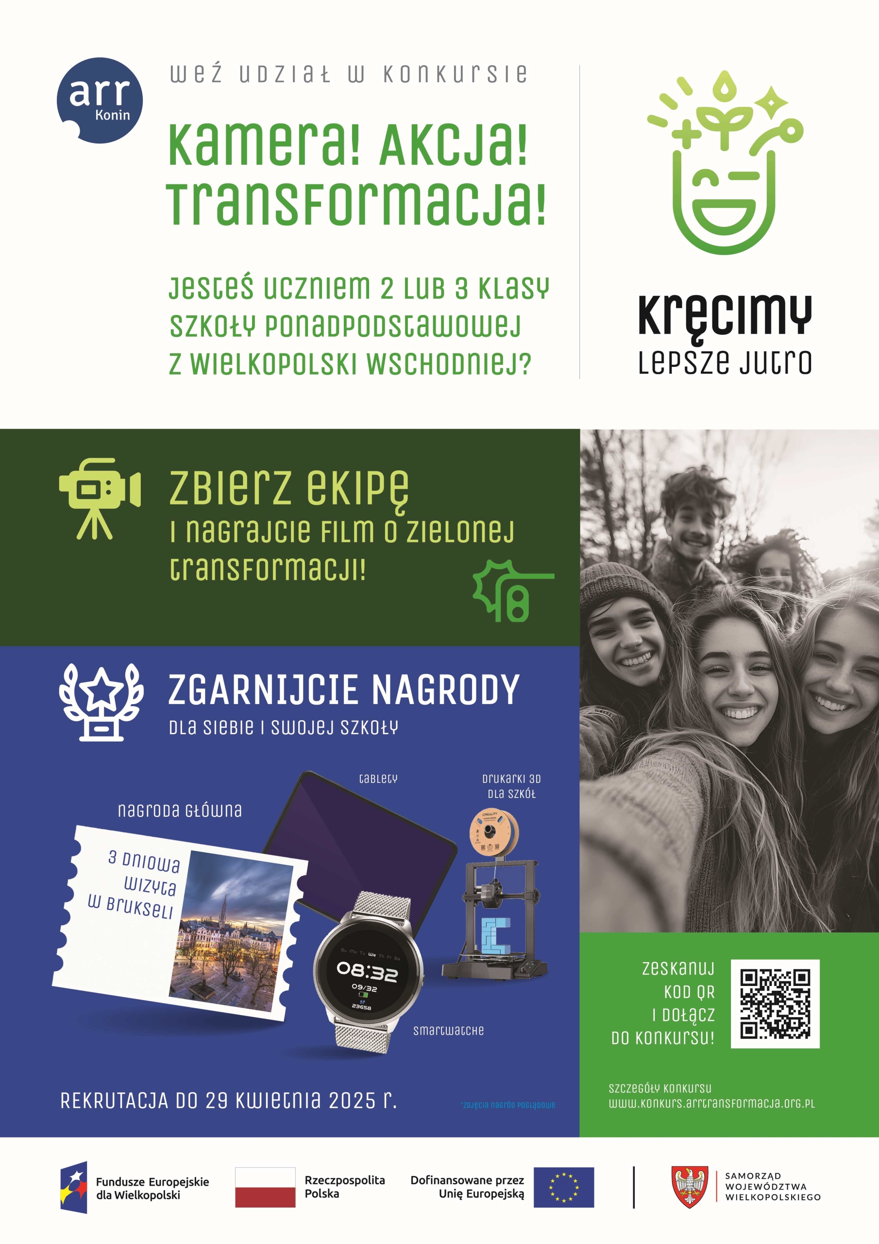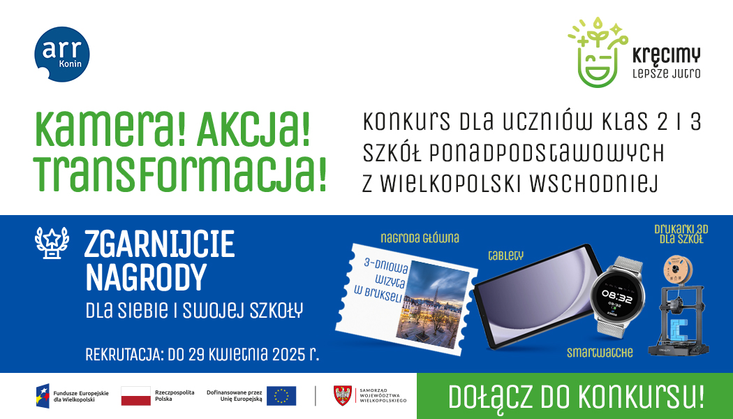 Agencja Rozwoju Regionalnego S.A. w Koninie zaprasza uczniów klas II i III szkół ponadpodstawowych z Wielkopolski Wschodniej do wzięcia udziału w wyjątkowym konkursie filmowym pt. „Kamera! Akcja! Transformacja! – Kręcimy lepsze jutro”.