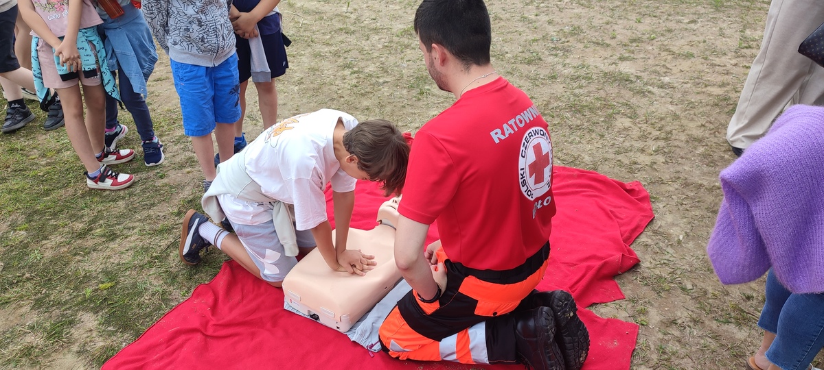 Dużym zainteresowaniem cieszyły się również zajęcia prowadzone przez pracownika Oddziału Rejonowego Polskiego Czerwonego Krzyża w Kole, który wprowadził dzieci w podstawy udzielania pierwszej pomocy. Uczestnicy mogli praktycznie przećwiczyć resuscytację na specjalnym manekinie oraz nauczyć się, jak bezpiecznie wyjąć kleszcza.