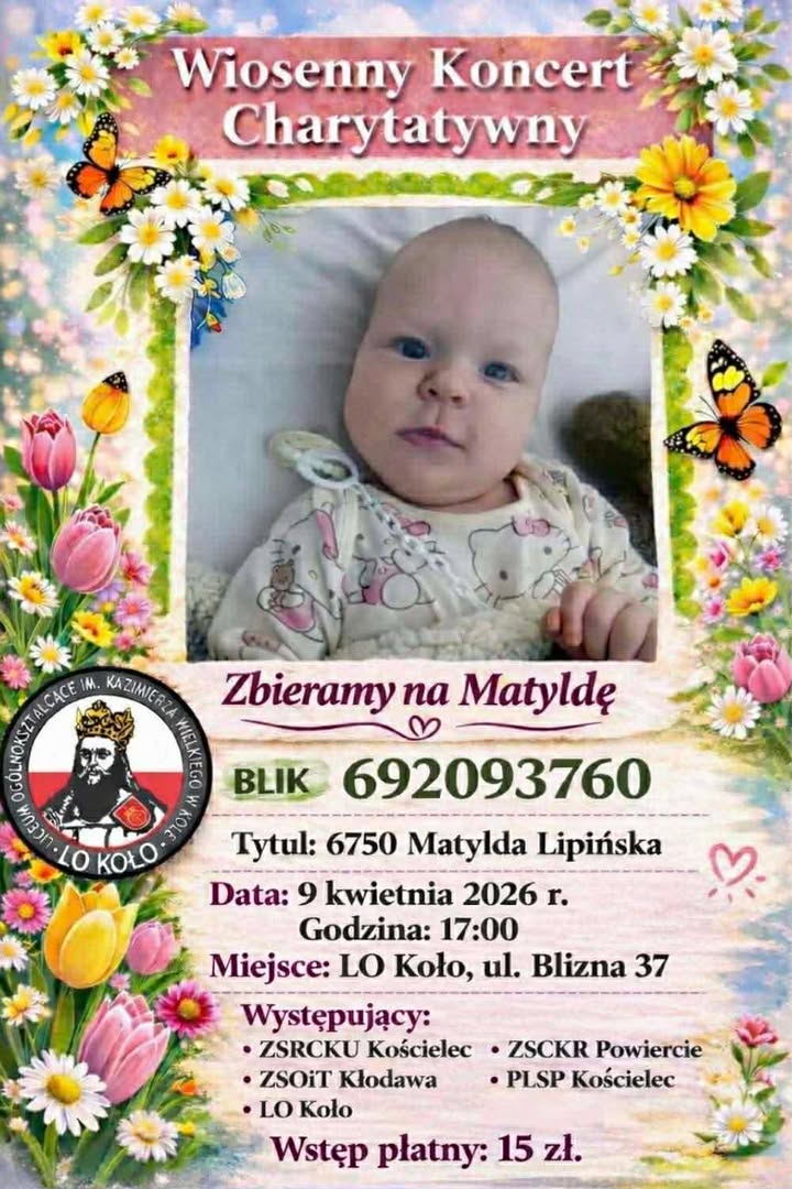 8 kwietnia, 2026 Aktualnosci Liceum Ogólnokształcące im Kazimierza Wielkiego w Kole informuje! Jutro gramy dla Matyldy. Zapraszamy! W trakcie koncertu odbędzie się licytacja obrazów uczniów Państwowego Liceum Sztuk Plastycznych w Kościele oraz tomików wierszy nauczyciela LO Koło, p.Roberta Sochy. – – – – Udostępnij: