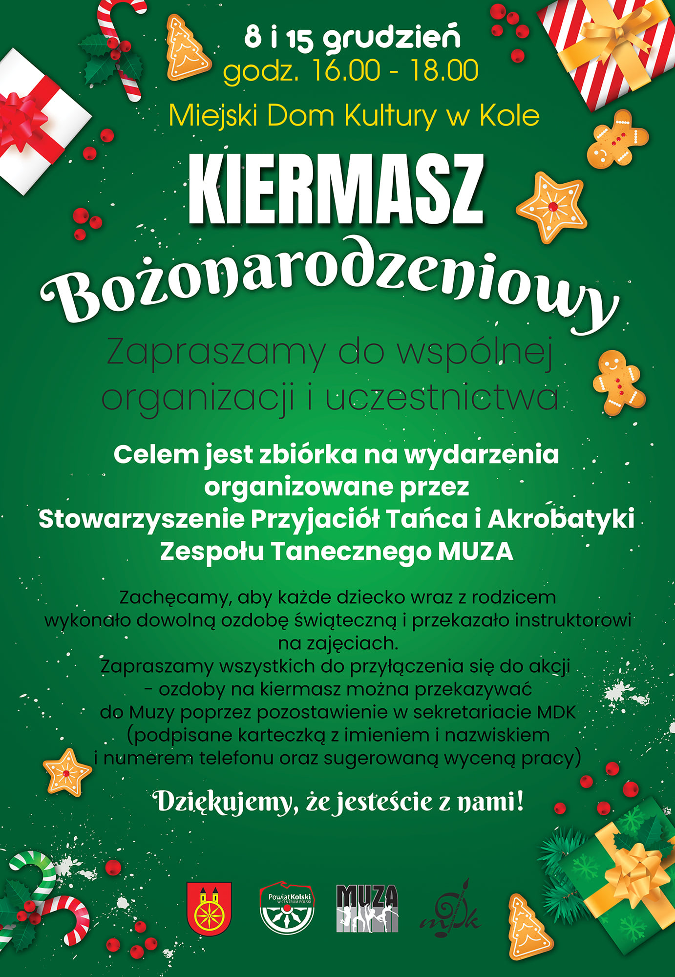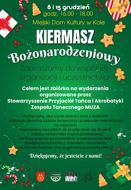 7 grudnia, 2021 Aktualnosci W dniach 8 i 15 grudnia w MDK w godzinach 16.00-18.00 zapraszamy na Kiermasz Bożonarodzeniowy prac dzieci, rodziców i instruktorów z Zespołu Tanecznego MUZA z MDK Koło źródło:Zespół Taneczny Muza Udostępnij: