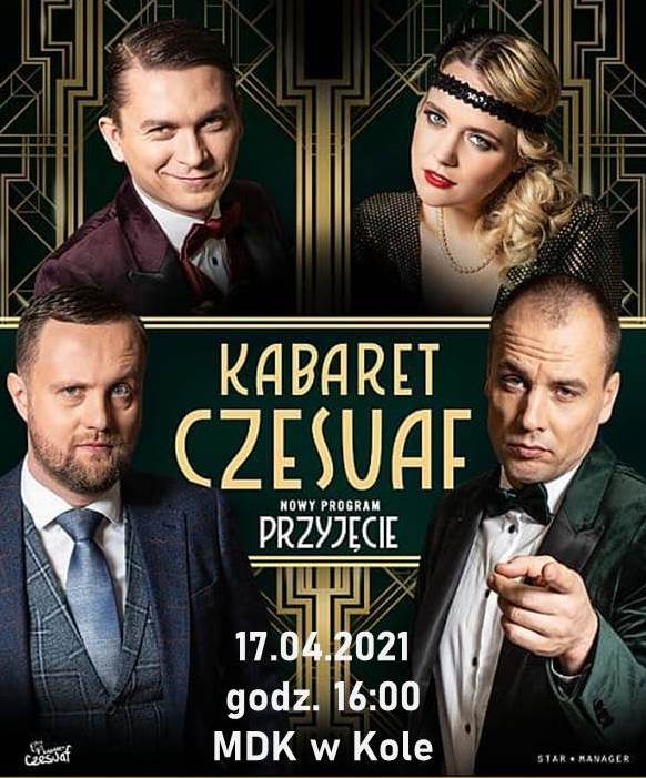 MDK w Kole zaprasza na “PRZYJĘCIE” Z KABARETEM CZESUAF, które odbędzie się w dniu 04 -17- 2021 w Miejskim Domu Kultury w Kole ul. Słowackiego 5, godz.16:00 Zapraszamy!