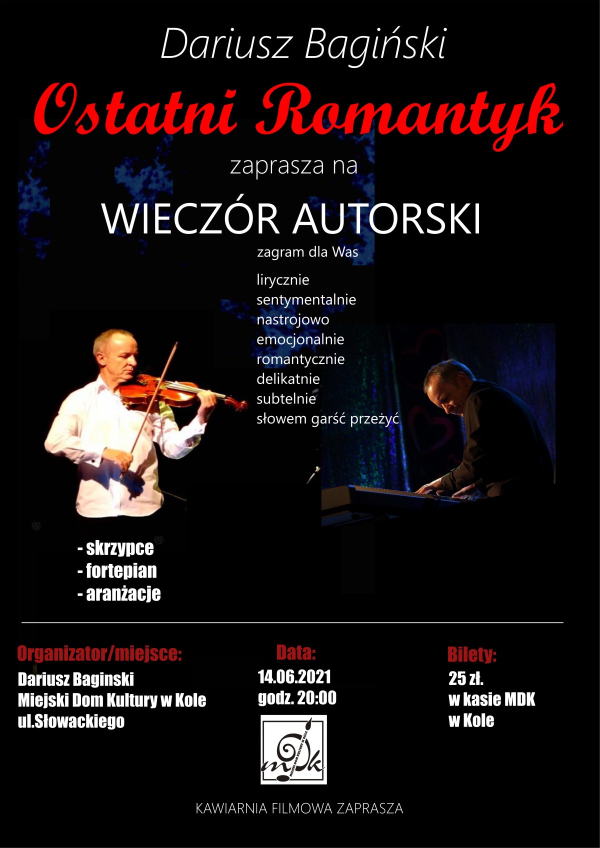 21 maja, 2021 Aktualnosci Kulturalne Kiedy: 2021-06-14 Godzina: 20:00:00 Miejsce: Miejski Dom Kultury, ul. Słowackiego 5, Koło Cena: 25 zł Bilety do nabycia w kasie MDK tel. 63 27 22 847 źródło:MDK w Kole Udostępnij: