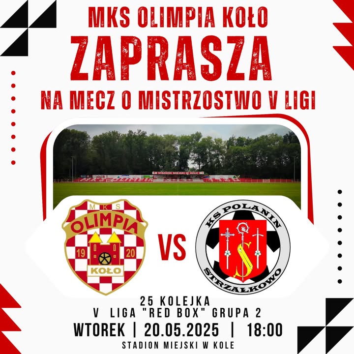 19 maja, 2025 Aktualnosci Sport Mecz o Mistrzostwo V Ligi pomiędzy miejscową MKS Olimpia Koło a KS POLANIN Strzałkowo. – Udostępnij: