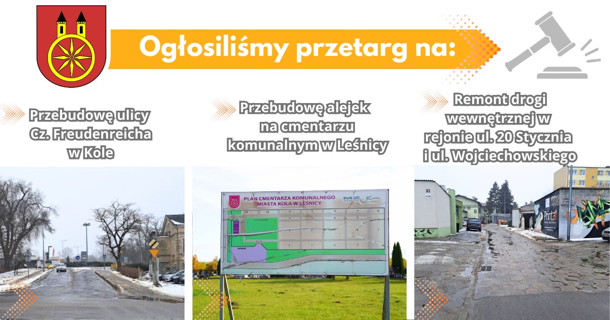 13 marca, 2026 Aktualnosci Miasto Koło ogłosiło postępowania przetargowe na realizację trzech ważnych inwestycji infrastrukturalnych: Przebudowa ul. Cz. Freudenreicha Przebudowa alejek na Cmentarzu Komunalnym w Leśnicy Remont drogi wewnętrznej w rejonie ul. 20 Stycznia i Wojciechowskiego Termin składania ofert: 27 marca 2026 r., godz. 12:00. Zachęcamy zainteresowane firmy do zapoznania się ze szczegółami postępowań w dokumentacji przetargowej. Ogłoszenie: https://www.kolo.pl/…/realizacja-trzech-zada… – Udostępnij: