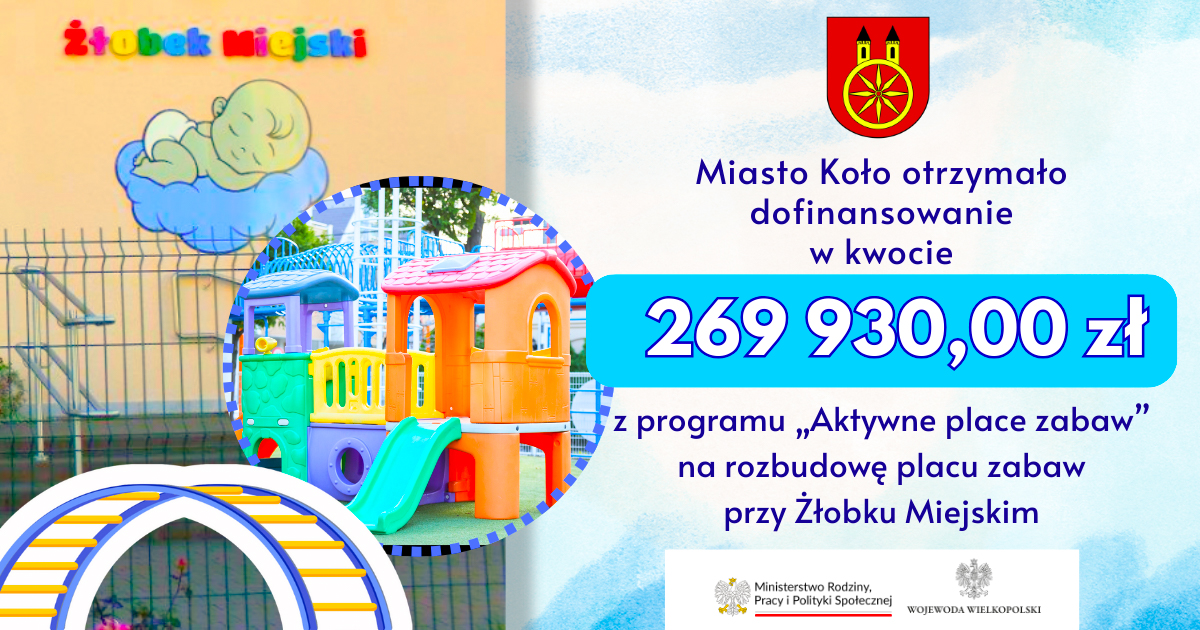 27 stycznia, 2026 Aktualnosci Miasto Koło otrzymało fundusze na rozbudowę placu zabaw przy Żłobek Miejski w Kole, w kwocie 269.930,00 złotych. – Udostępnij: