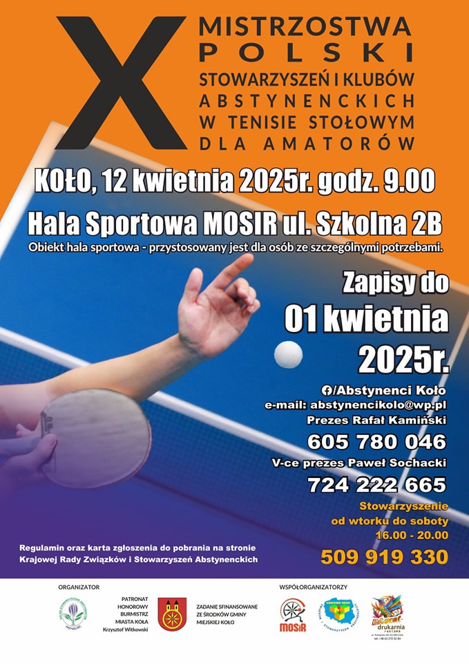 12 kwietnia, 2025 Aktualnosci Sport MOSiR Koło – X Mistrzostwa Polski w Tenisie Stołowym Stowarzyszeń i Klubów Abstynenckich dla amatorów. Zapraszamy! – Udostępnij: