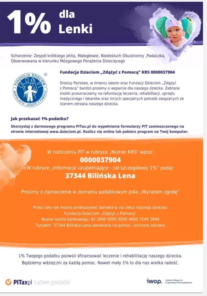 Rodzice Lenki, Stowarzyszenie W Koło Pomagam oraz Sebastian Szczesiak proszą o kontakt osoby lub instytucje które chcą pomóc w leczeniu Lenki. Proszą też o przekazanie 1 % na leczenie tej małej Dziewczynki.