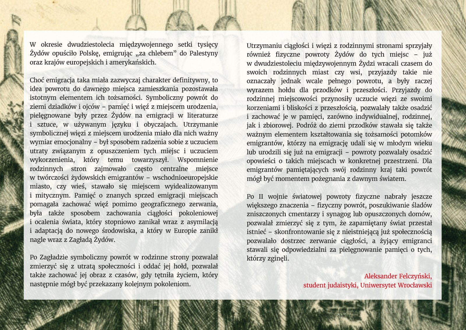 Do Państwa dyspozycji oddajemy także ulotkę z tekstem Aleksandra Felczyńskiego (Uniwersytet Wrocławski) o fizycznych i symbolicznych powrotach żydowskiej diaspory.