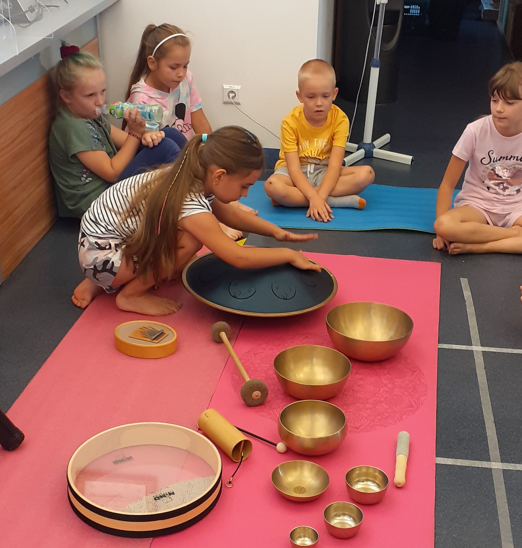 Kolejny dzień „Wakacji z Hedwigą”… Dziś gościliśmy panią Dorotę Karaszewską z Masaż i terapia dźwiękiem. Podczas zajęć dzieci poznały różne odsłony dźwięku, wydawane przez egzotyczne instrumenty: kij deszczowy rodem z Ewadoru, Chile i Meksyku; bęben oceaniczny; misy tybetańskie i misy relaksacyjne zen; gong; sansula, której korzenie pochodzą z południowej Afryki; dzwonek koshi i pochodzący z Rosji Rav Drum Celtic major B. Po prezentacji intuicyjnego sposobu grania wszyscy uczestnicy eksperymentowali z instrumentami, a na koniec doświadczyli „kąpieli dźwiękiem”. Pozostajemy pod wrażeniem zajęć… było wspaniale.
