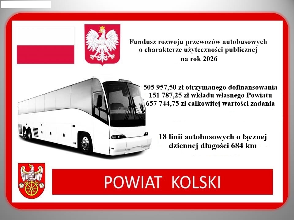 Z radością informujemy, że nasz powiat został beneficjentem projektu w ramach Funduszu Rozwoju Przewozów Autobusowych o charakterze użyteczności publicznej. Na mocy umowy zawartej 11 lutego 2026 roku z Wojewodą Wielkopolskim Agata Sobczyk, w 2026 roku zrealizujemy zadanie organizacji publicznego transportu zbiorowego na naszym terenie.