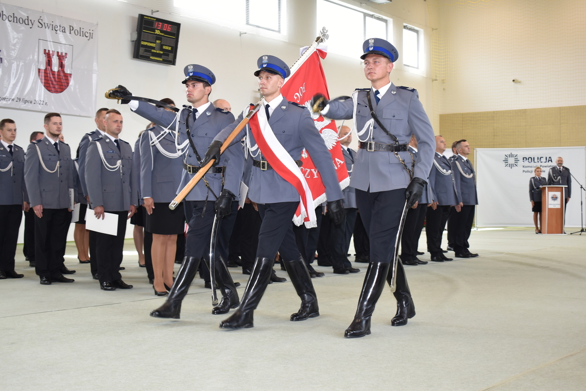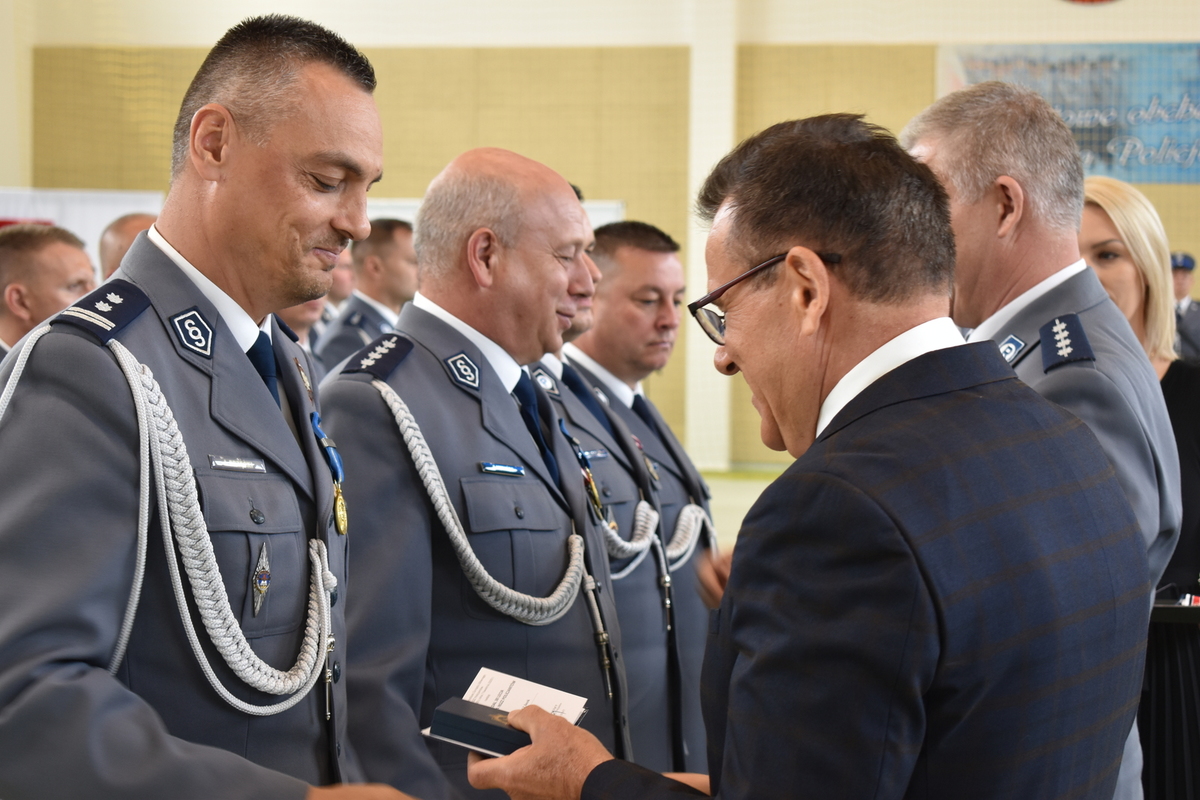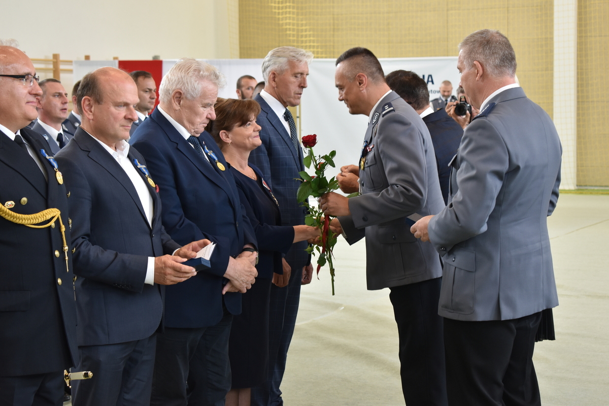 Komendant Powiatowy Policji w Kole mł. insp. Jacek Brzęcki po przywitaniu gości w słowach skierowanych do podległych policjantów, podziękował za zaangażowanie i codzienny trud pełnienia służby, który przyczynia się do zapewnienia bezpieczeństwa na terenie powiatu kolskiego. Podkreślił, że nowe zadania, które postawiono przed Policją, związane z pandemią oraz obroną przejść granicznych, dzięki zaangażowaniu i chęci niesienia pomocy zostały zrealizowane. Słowa uznania skierował do pracowników cywilnych Policji, zatrudnionych w kolskiej komendzie, od których w znacznej mierze zależy sprawność i skuteczność działań policyjnych. Podziękowanie skierował do reprezentantów pozostałych służb mundurowych, inspekcji i instytucji za codzienną współpracę.