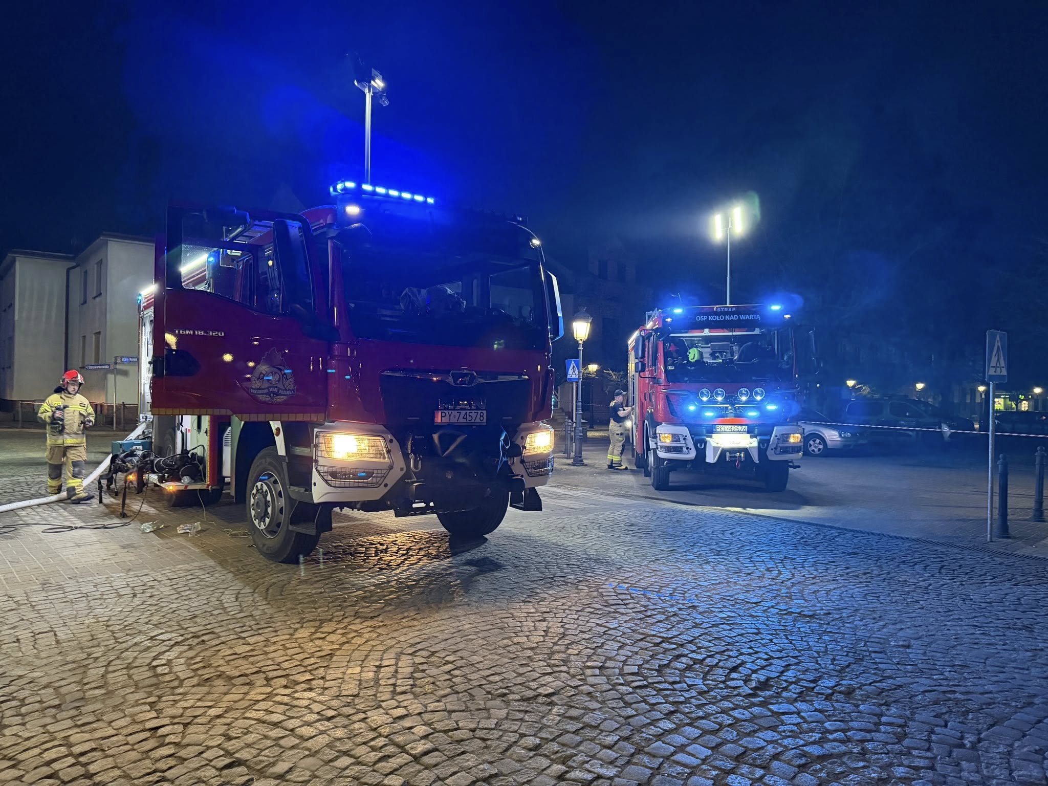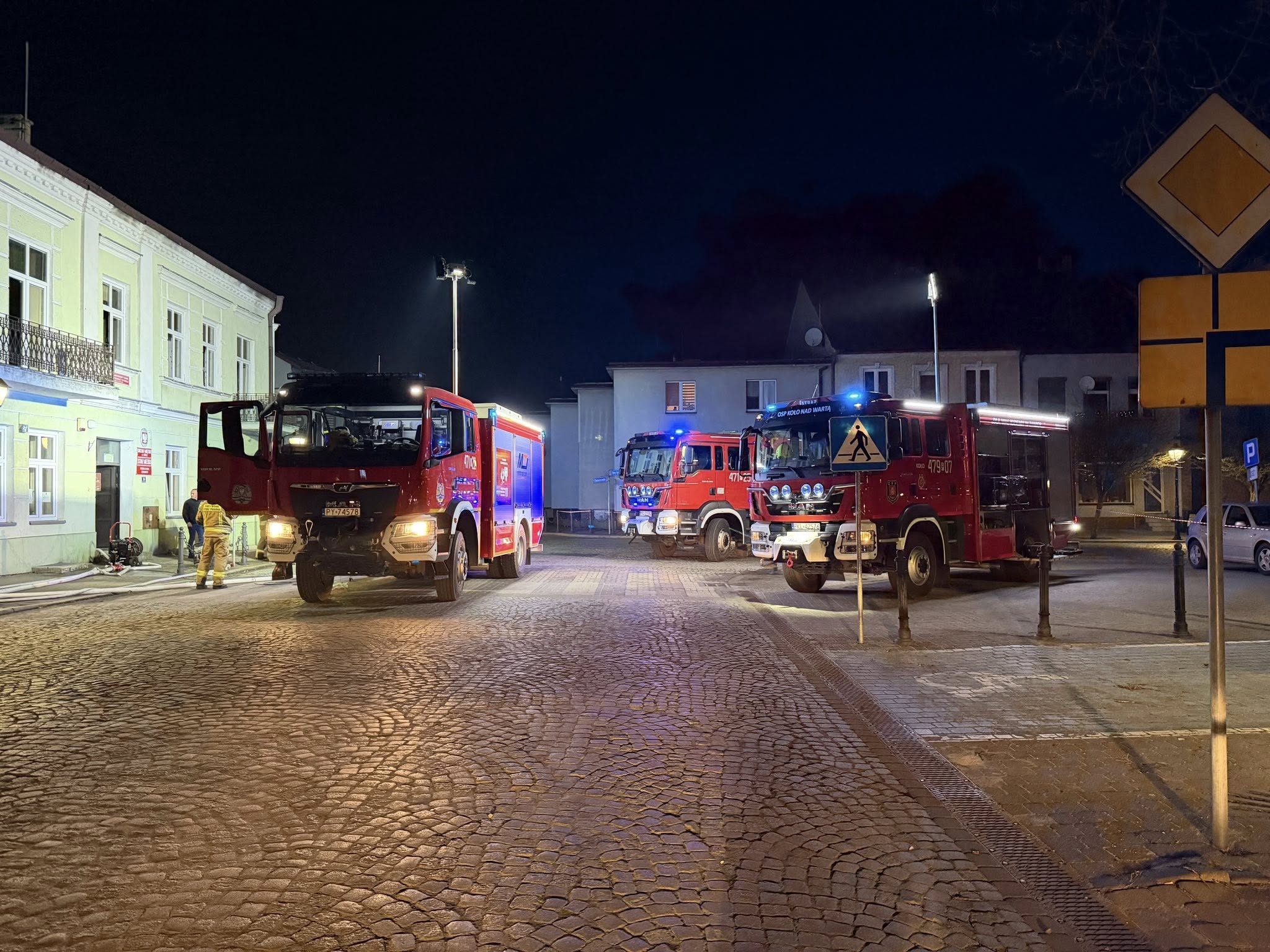 Na miejsce zdarzenia niezwłocznie skierowano zastępy z Komendy Powiatowej Państwowej Straży Pożarnej w Kole, a także jednostki Ochotniczej Straży Pożarnej: , OSP Wrząca Wielka, OSP Koło nad Wartą, OSP Ruszków Pierwszy oraz Policję, Pogotowie energetyczne, Powiatowy Inspektor Nadzoru Budowlanego w Kole.