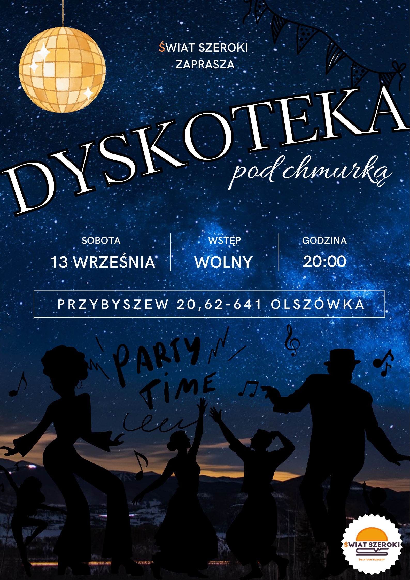 Restauracja Świat Szeroki Przybyszew zaprasza na Dyskotekę pod chmurką!