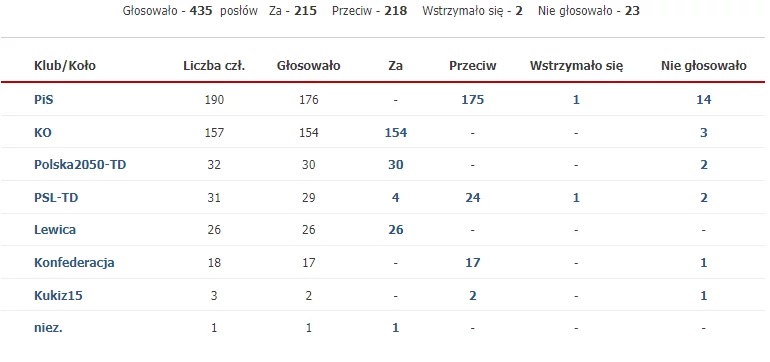 Sejm nie uchwalił nowelizacji Kodeksu karnego, likwidującej kary za pomoc w dokonaniu aborcji oraz wyłączającej karalność przerywania ciąży za zgodą kobiety w sytuacji ciężkiego, nieodwracalnego upośledzenia lub nieuleczalnej choroby płodu. W piątkowym (12 lipca) głosowaniu wzięło udział 435 posłów Za uchwaleniem ustawy głosowało 215 posłów, przeciw uchwaleniu było 218 posłów, a wstrzymało się dwóch.