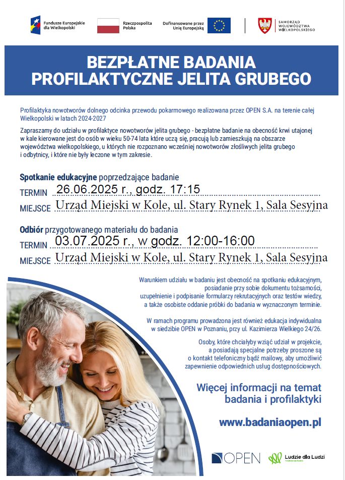Ośrodek Profilaktyki i Epidemiologii Nowotworów w Poznaniu rozpoczyna w mieście Kole realizację programu pod nazwą „Profilaktyka nowotworów dolnego odcinka przewodu pokarmowego realizowana przez OPEN S.A. na terenie całej Wielkopolski w latach 2024-2027”. Projekt ten jest realizowany w ramach Programu Fundusze Europejskie dla Wielkopolski 2021-2027 (FEW) współfinansowanego ze środków Europejskiego Funduszu Społecznego Plus.