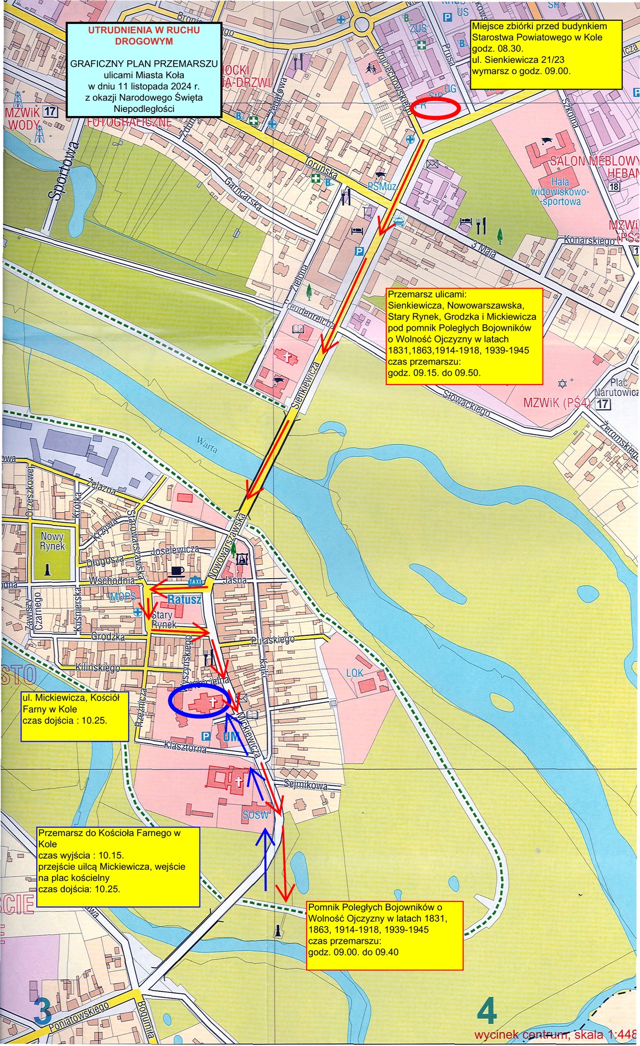 Uprzejmie informujemy, że w dniu 11 listopada 2024 r. odbędą się uroczystości związane z obchodami Narodowego Święta Niepodległości w Kole, w trakcie których od godziny 09.00 do godziny 10.25 nastąpi przemarsz ulicami miasta kolumny marszowej składającej się z około 200 osób. Przemarsz odbędzie się ulicami: Sienkiewicza, Nowowarszawska, Stary Rynek, Grodzka i Mickiewicza pod pomnik ,,Poległym Bojownikom o Wolność Ojczyzny w latach 1831, 1863, 1914 – 1918, 1939 – 1945” nad Kanałem Ulgi rzeki Warty oraz powrót ulicą Mickiewicza i Kościelną do Kościoła Podwyższenia Krzyża Świętego w Kole.
