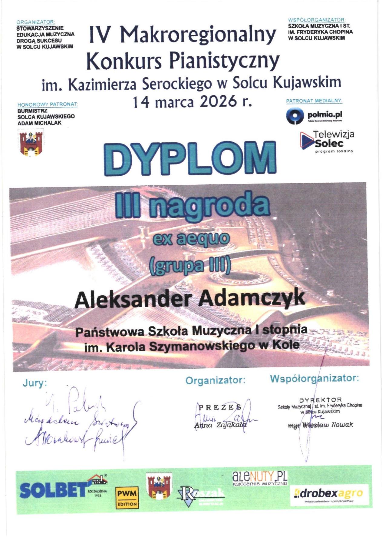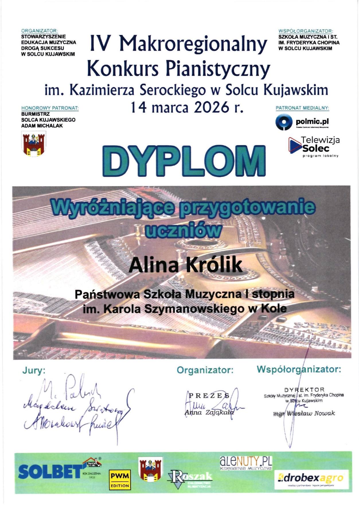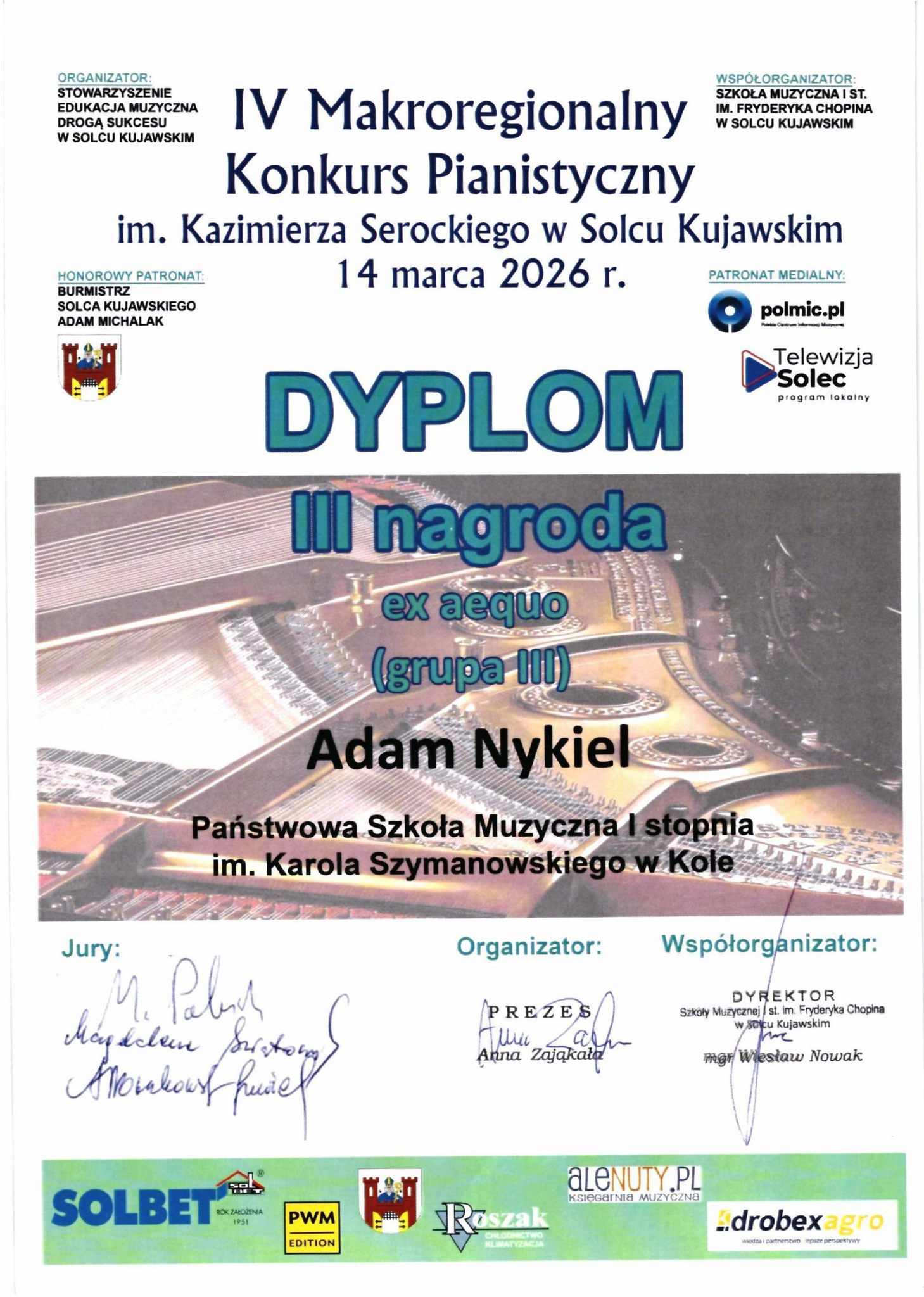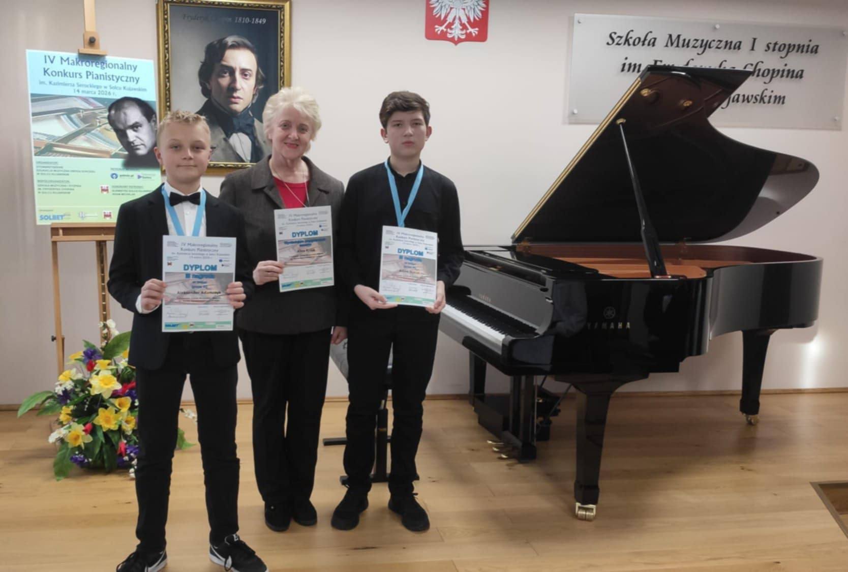 Z radością informujemy o kolejnym sukcesie uczniów Państwowej Szkoły Muzycznej im. Karola Szymanowskiego w Kole. 14 marca młodzi pianiści – Adam Nykiel oraz Aleksander Adamczyk, uczniowie klasy fortepianu prowadzonej przez panią Alinę Królik – wzięli udział w IV Międzyregionalnym Konkursie Pianistycznym w Solcu Kujawskim.