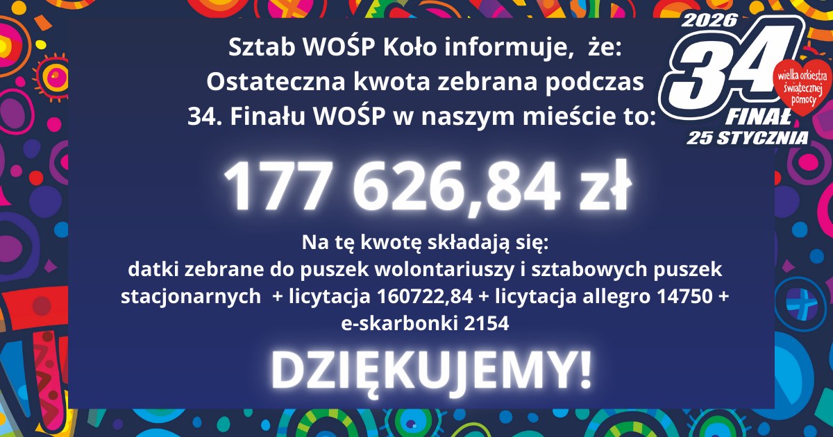 9 lutego, 2026 Aktualnosci Sztab WOŚP Koło podaje ostateczną kwotę, jaką zebraliśmy w naszym mieście w ramach 34. Finału! Jest to 177.626,84 zł! – Udostępnij: