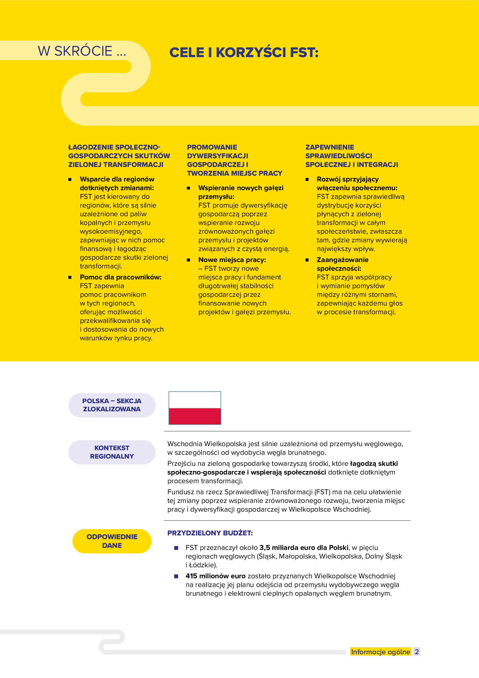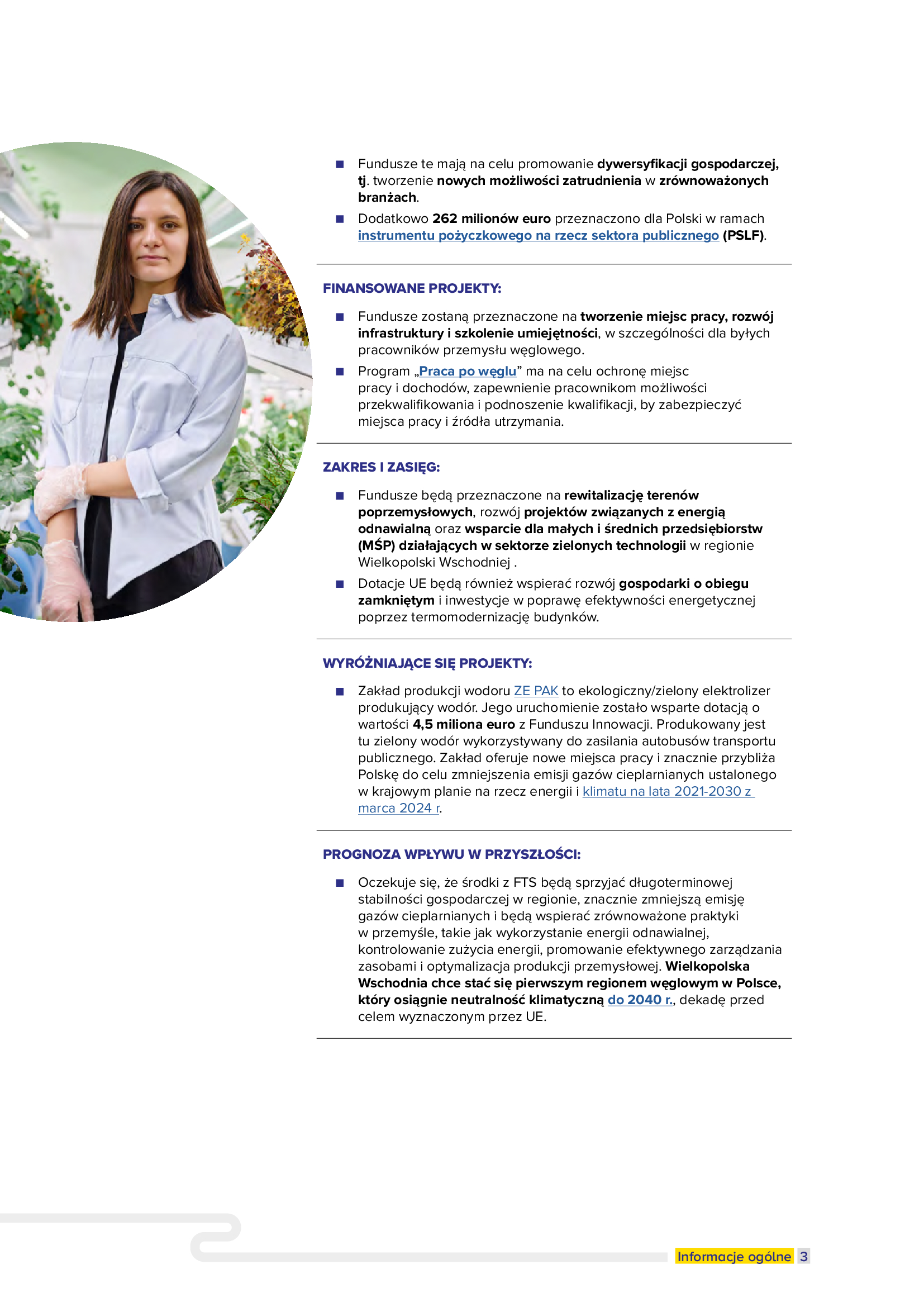 Fundusz wspiera regiony i pracowników najbardziej dotkniętych tą transformacją, zapewniając pomoc finansową i sprzyjając zrównoważonemu wzrostowi gospodarczemu. Jest kluczowym elementem Europejskiego Zielonego Ładu (https://commission.europa.eu/…/european-green-deal_en, gwarantując, że przejście do zielonej gospodarki jest sprawiedliwe i inkluzywne. Celem jest nie pozostawienie nikogo z tyłu, poprzez oferowanie ukierunkowanego wsparcia najbardziej narażonym regionom i społecznościom.