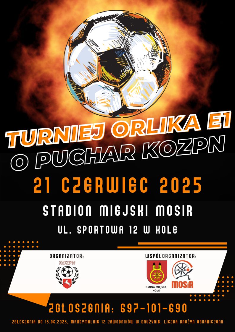 Może być zdjęciem przedstawiającym tekst „TURNIEJ ORLIKA E1 O PUCHAR KOZPN 21 1CZERWICC 2025 STADION MIGJSKI MOSIR UL. SPORTOWA 12 W KOLG ORGANIZATOR: ΚΟΖΡΗ WSPÓLORGANIZATOR: GMINA MIEJSKA KOLO MOSıR 2GLOSZENIA: ZGLOSZGNIADO DO 00 15.06.2025, 025, MAHSYMALAIS 2 AWODNIHOW 697-101-690 DRU2YNIG LIC2BA DRUŻYN OGRAN OGRANICZONA C2OлA”