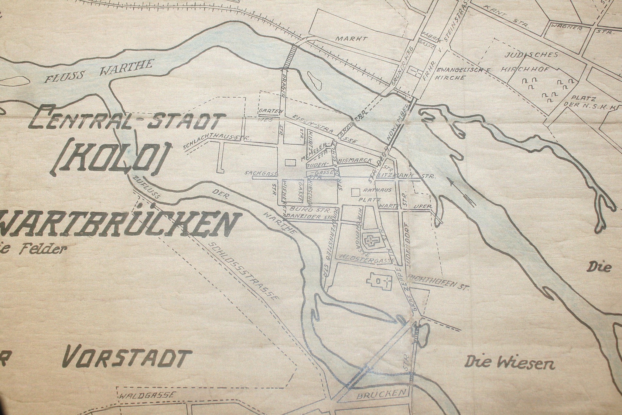Nr 2. Plan ulic Kolskiej Starówki z 1940 roku oraz – od strony lewej pierwsza przeprawa na Warcie (kreskowana) dla bydła do 1945 roku – druga (linią przerywaną) – dawny most na Warcie do 1830 roku od ul. Starowarszawskiej do Zielonej – trzecia – aktualny most na Warcie z Kolskiej Starówki